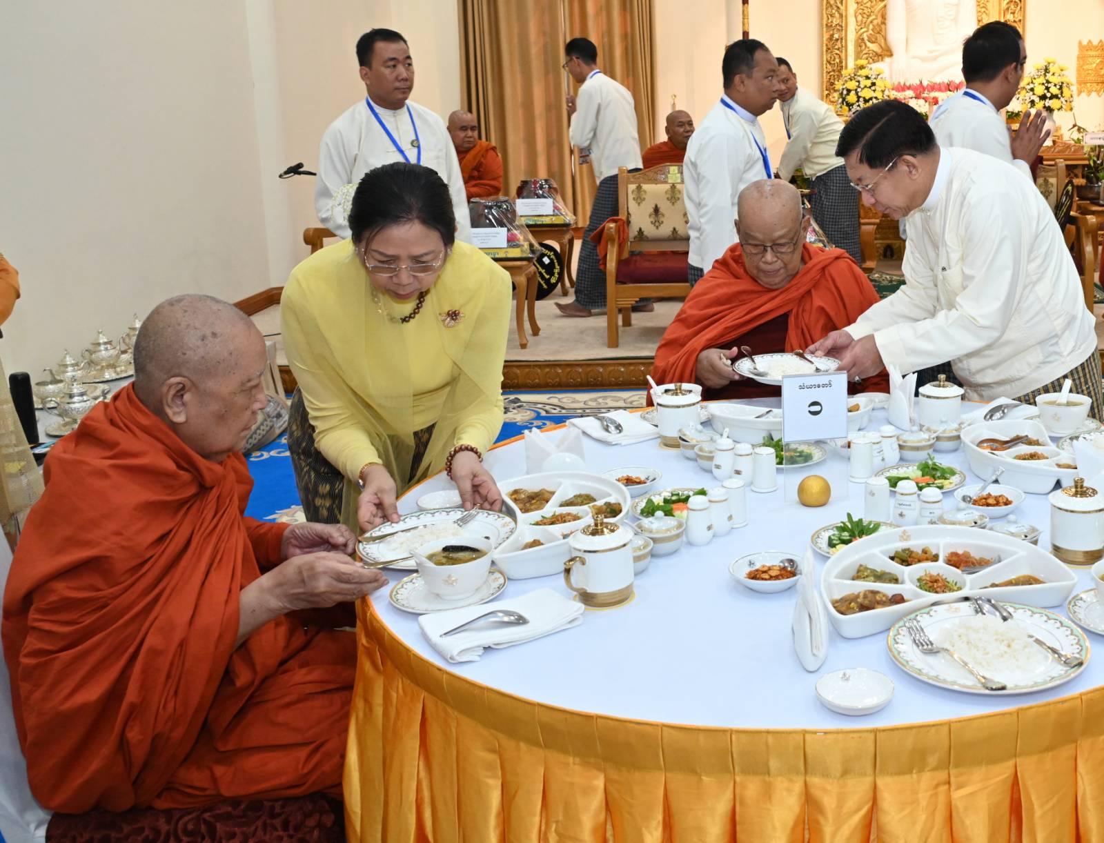 အခမ်းအနားသို့ လယ်ဝေးမြို့၊ ပေါက်မြိုင်ကျောင်းတိုက်ပဓာနနာယက အဘိဓဇမဟာရဋ္ဌဂုရု ဘဒ္ဒန္တဇနိန္ဒ အမှူးပြုသည့် ဆရာတော်ကြီးများနှင့် မာရဝိဇယကျောင်းတော်တွင် သီတင်းသုံးတော်မူကြသည့် ဆရာတော်ကြီးများ ကြွရောက်ချီးမြှင့်တော်မူကြပြီး နိုင်ငံတော်စီမံအုပ်ချုပ်ရေးကောင်စီဥက္ကဋ္ဌ နိုင်ငံတော်ဝန်ကြီးချုပ် ဗိုလ်ချုပ်မှူးကြီး မင်းအောင်လှိုင်နှင့်ဇနီး ဒေါ်ကြူကြူလှ တို့နှင့်အတူ နိုင်ငံတော်စီမံအုပ်ချုပ်ရေးကောင်စီ ဒုတိယဥက္ကဋ္ဌ ဒုတိယဝန်ကြီးချုပ် ဒုတိယဗိုလ်ချုပ်မှူးကြီး စိုးဝင်းနှင့်ဇနီး ဒေါ်သန်းသန်းနွယ်၊ ကောင်စီအတွင်းရေးမှူးနှင့်ဇနီး၊ တွဲဖက်အတွင်းရေးမှူးနှင့်ဇနီး၊ ကောင်စီဝင်များနှင့်ဇနီးများ၊ ပြည်ထောင်စုဝန်ကြီးများနှင့်ဇနီး၊ နေပြည်တော်ကောင်စီဥက္ကဋ္ဌ၊ ကာကွယ်ရေးဦးစီးချုပ်ရုံးမှ အဆင့်မြင့် တပ်မတော်အရာရှိကြီးများနှင့်ဇနီးများ၊ နေပြည်တော်တိုင်းစစ်ဌာနချုပ်တိုင်းမှူးနှင့် တာဝန်ရှိသူများ တက်ရောက်ကြသည်။