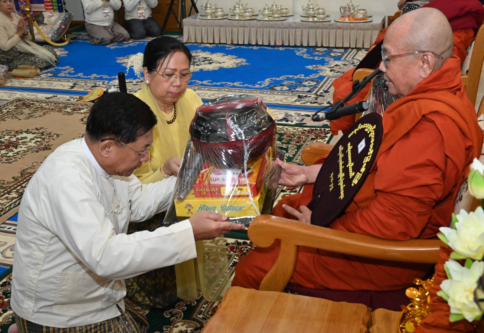 ဆက်လက်ပြီး ကောင်စီအတွင်းရေးမှူးနှင့်ဇနီး၊ တွဲဖက်အတွင်းရေးမှူးနှင့်ဇနီး၊ ကောင်စီဝင်များ၊ ပြည်ထောင်စုဝန်ကြီးများက ဆရာတော်၊ သံဃာတော်များထံ ကထိန်သင်္ကန်းနှင့် လှူဖွယ်ပစ္စည်းများကို အသီးသီး ဆက်ကပ်လှူဒါန်းကြသည်။