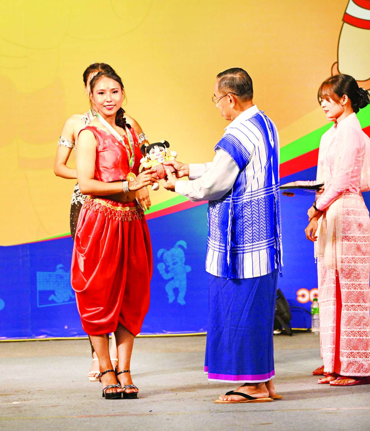 ဆက်လက်၍ နိုင်ငံတော်စီမံအုပ်ချုပ်ရေးကောင်စီအဖွဲ့ဝင် ဦးရွှေကြိမ်းက အမျိုးသမီး (၁၆၀) စင်တီမီတာအထက် Model Physique ပြိုင်ပွဲတွင် ပထမဆုရရှိသည့် ရန်ကုန်တိုင်းဒေသကြီး၊ ဒုတိယဆုရရှိသည့် စစ်ကိုင်းတိုင်းဒေသကြီးနှင့် တတိယဆုရရှိသည့် ဧရာဝတီတိုင်းဒေသကြီးတို့မှ ပြိုင်ပွဲဝင်များကိုလည်းကောင်း၊ နိုင်ငံတော်စီမံအုပ်ချုပ်ရေးကောင်စီအဖွဲ့ဝင် မန်းငြိမ်းမောင်က အမျိုးသမီး Fitness Physique ပြိုင်ပွဲတွင် ပထမဆုရရှိသည့် စစ်ကိုင်းတိုင်းဒေသကြီး၊ ဒုတိယဆုရရှိ သည့် ရန်ကုန်တိုင်းဒေသကြီးနှင့် တတိယဆုရရှိသည့် ရခိုင်ပြည်နယ်တို့မှ ပြိုင်ပွဲဝင်များကိုလည်းကောင်း တစ်ဦးချင်းဂုဏ်ပြုဆုတံဆိပ်နှင့် အမျိုးသားအားကစား ပွဲတော်အထိမ်းအမှတ်အရုပ်အား ပေးအပ်ချီးမြှင့်သည်။