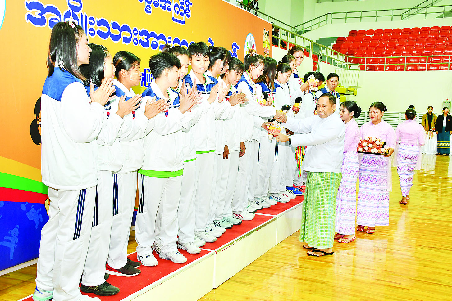 ဆက်လက်၍ ကရင်ပြည်နယ်အစိုးရအဖွဲ့ လူမှုရေးရာဝန်ကြီး ဦးစောထွန်းအောင်က အမျိုးသမီး(သွှေ့လျန့်) ပြိုင်ပွဲတွင် ပထမဆုရရှိသည့် မန္တလေးတိုင်းဒေသကြီး၊ ဒုတိယဆုရရှိသည့် ရှမ်းပြည်နယ်နှင့် တတိယဆုရရှိသည့် ဧရာဝတီတိုင်းဒေသကြီးအသင်းတို့မှ ပြိုင်ပွဲဝင်များကိုလည်းကောင်း၊ နေပြည်တော်ကောင်စီဝင် ဦးမြင့်စိုးက အမျိုးသမီး (၄၈) ကီလိုတန်း ဆန်းဆိုပြိုင်ပွဲတွင် ပထမဆုရရှိသည့် ပဲခူးတိုင်းဒေသကြီး၊ ဒုတိယဆုရရှိသည့် ရှမ်းပြည်နယ်၊ ပူးတွဲတတိယဆုရရှိသည့် ချင်းပြည်နယ်နှင့် ကချင်ပြည်နယ်အသင်းတို့မှ ပြိုင်ပွဲဝင်များကိုလည်းကောင်း၊ ပညာရေးဝန်ကြီးဌာန ဒုတိယဝန်ကြီး ဒေါက်တာမိုးဇော်ထွန်းက အမျိုးသမီး (၅၂) ကီလိုတန်းဆန်းဆိုပြိုင်ပွဲတွင် ပထမဆုရရှိသည့် ပဲခူးတိုင်းဒေသကြီး၊ ဒုတိယဆုရရှိသည့် စစ်ကိုင်းတိုင်းဒေသကြီး၊ ပူးတွဲတတိယဆုရရှိသည့် ကရင်ပြည်နယ်နှင့် ကချင်ပြည်နယ်အသင်းတို့မှ ပြိုင်ပွဲဝင်များကိုလည်းကောင်း ဂုဏ်ပြုဆုတံဆိပ်နှင့် အမျိုးသားအားကစား ပွဲတော်အထိမ်းအမှတ်အရုပ်များ ပေးအပ်ချီးမြှင့်ကြသည်။