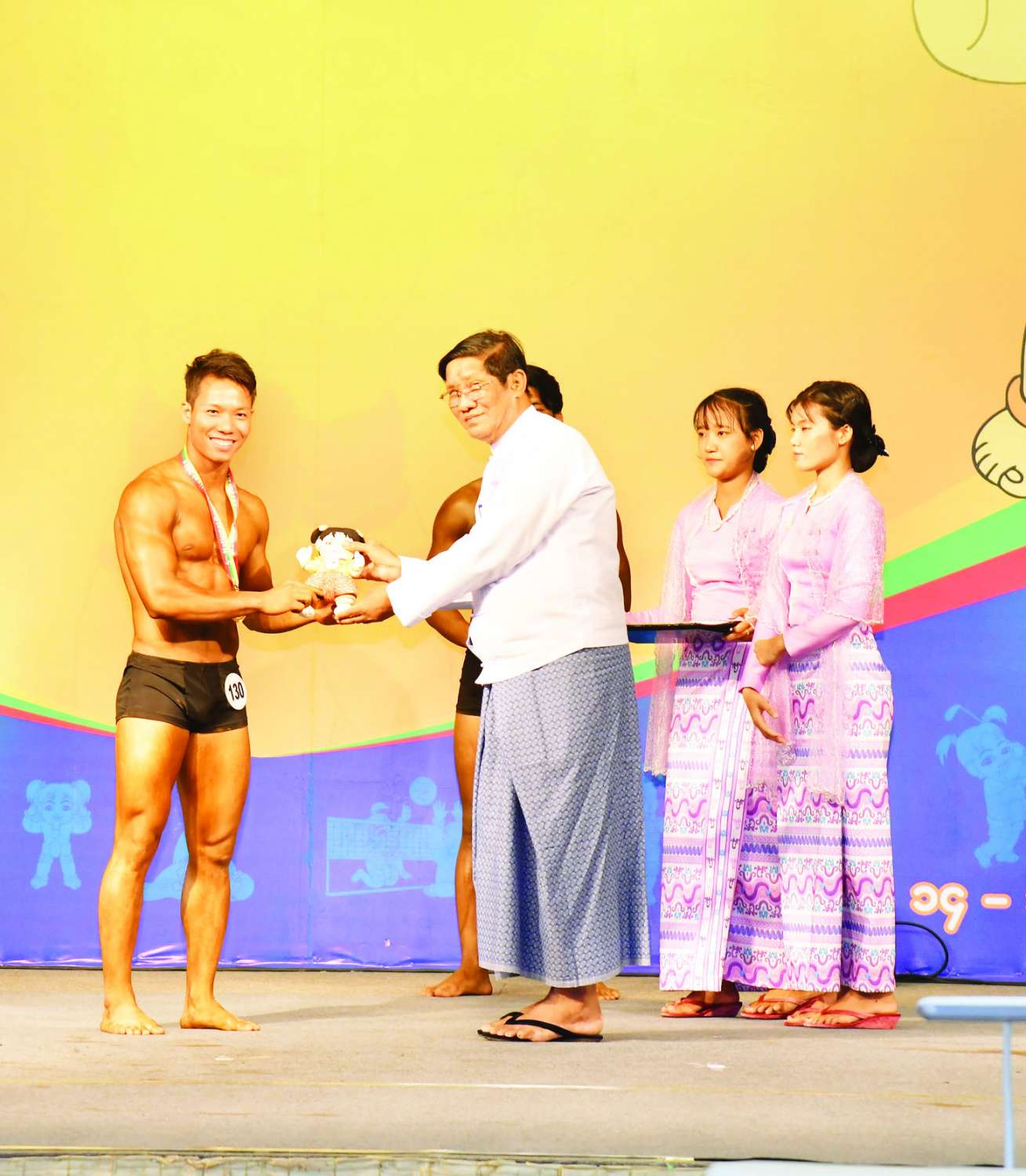 ဆက်လက်၍ နိုင်ငံတော်စီမံအုပ်ချုပ်ရေးကောင်စီဝင် ပြည်ထဲရေးဝန်ကြီးဌာန ပြည်ထောင်စုဝန်ကြီး ဒုတိယဗိုလ်ချုပ်ကြီး ရာပြည့်က အမျိုးသား (၁၇၀) စင်တီမီတာအထက် ကာယကြံ့ခိုင်မှု Athletic Physique ပြိုင်ပွဲတွင် ပထမဆုရရှိသည့် ပဲခူးတိုင်းဒေသကြီး၊ ဒုတိယဆုရရှိသည့် ရှမ်းပြည်နယ်နှင့် တတိယဆုရရှိသည့် ရန်ကုန်တိုင်းဒေသကြီးတို့မှ ပြိုင်ပွဲဝင်များကို ဂုဏ်ပြုဆုတံဆိပ်နှင့် အမျိုးသားအားကစားပွဲတော်အထိမ်းအမှတ် အရုပ်များအား ပေးအပ်ချီးမြှင့်သည်။