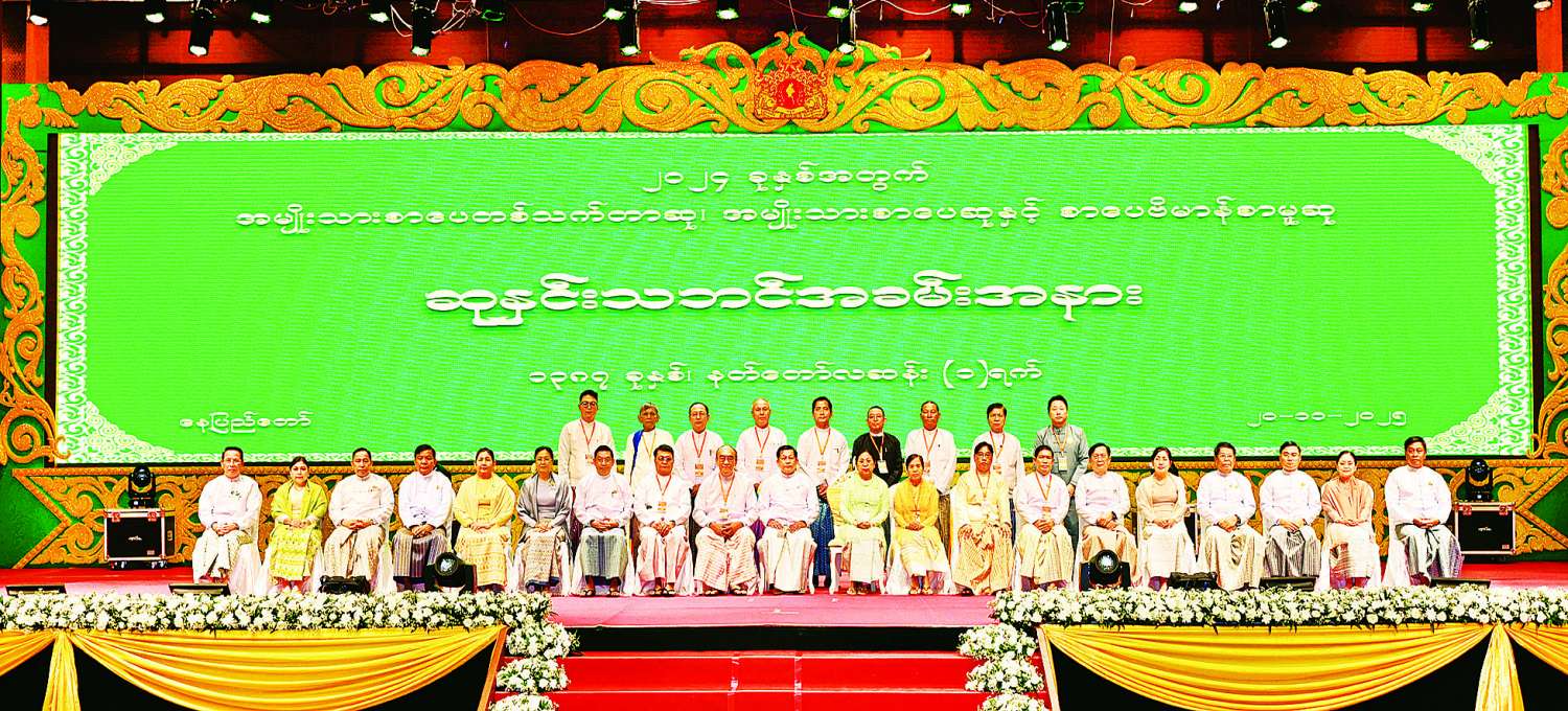 ၂၀၂၄ ခုနှစ်အတွက် အမျိုးသားစာပေတစ်သက်တာဆု၊ အမျိုးသားစာပေဆုနှင့် စာပေဗိမာန်စာမူဆု ဆုနှင်းသဘင်အခမ်းအနားကျင်းပ ပြည်ထောင်စုသမ္မတမြန်မာနိုင်ငံတော်ယာယီသမ္မတ နိုင်ငံတော်လုံခြုံရေးနှင့်အေးချမ်းသာယာရေးကော်မရှင်ဥက္ကဋ္ဌ ဗိုလ်ချုပ်မှူးကြီး မင်းအောင်လှိုင်နှင့်ဇနီး ဒေါ်ကြူကြူလှ တက်ရောက်ချီးမြှင့်ပေးအပ်