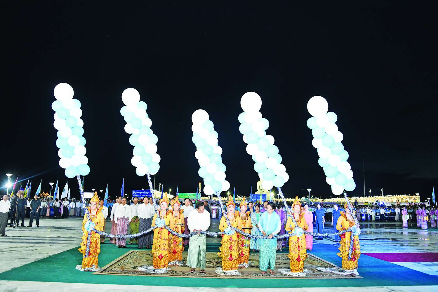 ထိုသို့ ဖဲကြိုးဖြတ်ဖွင့်လှစ်သည်နှင့်တစ်ပြိုင်နက် မီးပုံးပျံငယ်များကို တစ်ပြိုင်နက် လွှတ်တင်ခြင်း၊ မီးရှူးမီးပန်းများ ပစ်ဖောက်ခြင်းနှင့် မြိုင်မြိုင်ဆိုင်ဆိုင် လတန်ဆောင်တိုင် တေးသီချင်းဖြင့် ကပြဖျော်ဖြေခြင်းများကို ဆောင်ရွက်ကြရာ နိုင်ငံတော်ယာယီသမ္မတ နိုင်ငံတော်လုံခြုံရေးနှင့်အေးချမ်းသာယာရေးကော်မရှင်ဥက္ကဋ္ဌနှင့်ဇနီး၊ အခမ်းအနားတက်ရောက်လာကြသူများက ကြည့်ရှုအားပေးကြသည်။