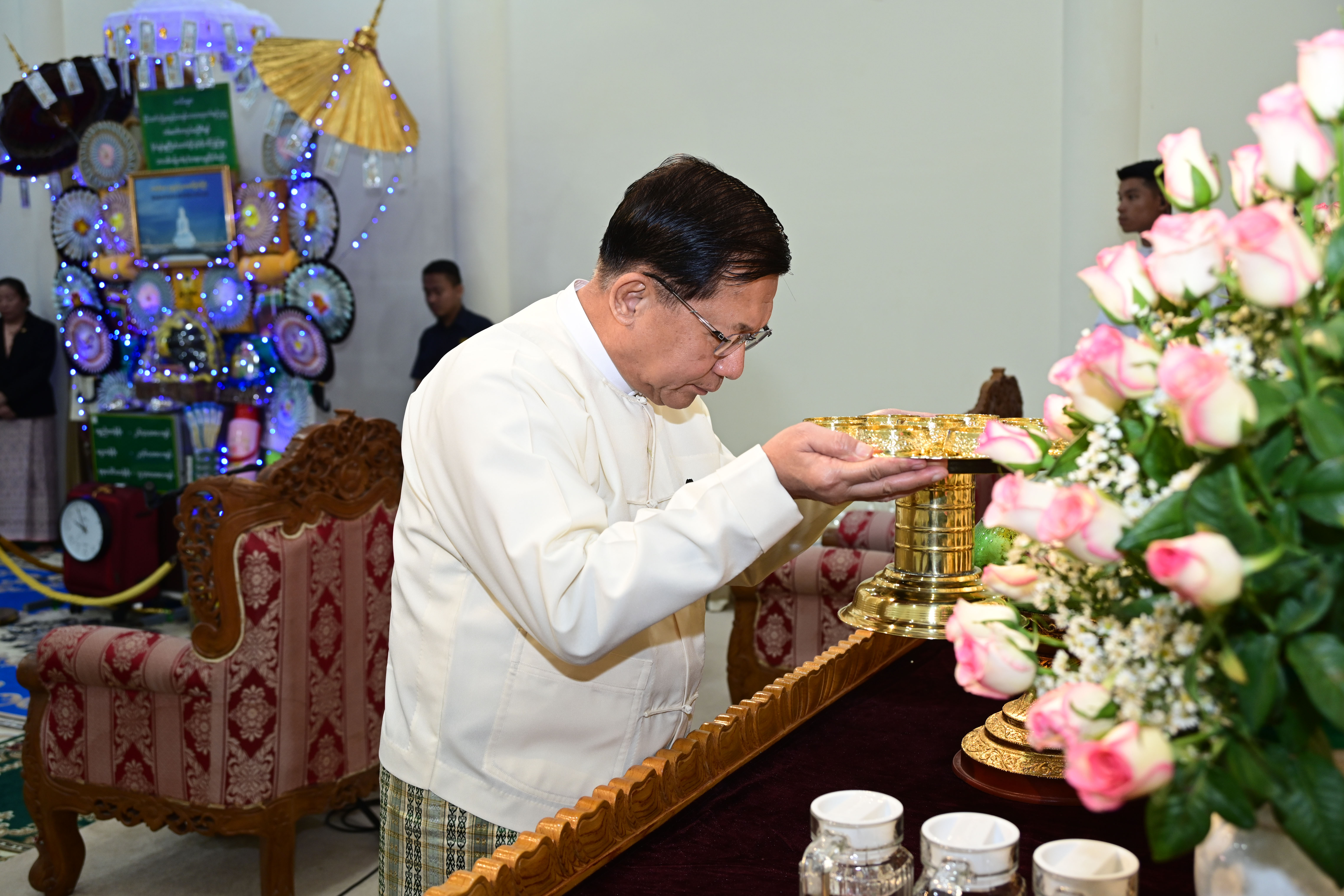 ဦးစွာ နိုင်ငံတော်ယာယီသမ္မတ နိုင်ငံတော်လုံခြုံရေးနှင့်အေးချမ်းသာယာရေးကော်မရှင်ဥက္ကဋ္ဌက မာရဝိဇယကျောင်းဆောင်တော်အတွင်းရှိ ဗုဒ္ဓရုပ်ပွားတော်မြတ်အား မြသပိတ်ဆွမ်းတော်၊ သစ်သီးနှင့် ပန်းမန်၊ သောက်တော်ရေချမ်းများ ကပ်လှူပူဇော်သည်။