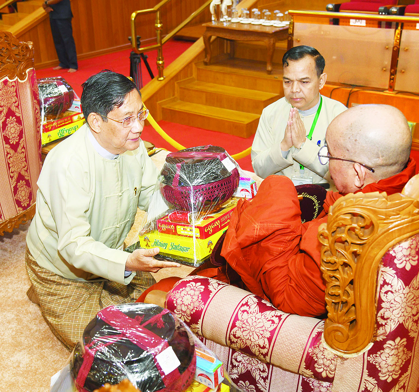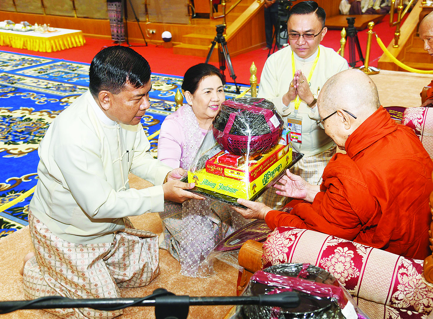 ၂၀၂၅ ခုနှစ်၊ သာသနာတော်ဆိုင်ရာ ဘွဲ့တံဆိပ်တော်ဆက်ကပ်ခံယူတော်မူမည့် ဆရာတော်ကြီးများအား နိုင်ငံတော်စီမံအုပ်ချုပ်ရေးကောင်စီဥက္ကဋ္ဌ နိုင်ငံတော်ဝန်ကြီးချုပ် ဗိုလ်ချုပ်မှူးကြီးမင်းအောင်လှိုင်နှင့်ဇနီးဒေါ်ကြူကြူလှတို့က ယနေ့နံနက်ပိုင်းတွင် နေပြည်တော်မာရဝိဇယဗုဒ္ဓဥယျာဉ်တော် ပရိဝုဏ်အတွင်းရှိ အဂ္ဂါဓိပတိသာသနာ့ဗိမာန်တော်ကြီး၌ နေ့ဆွမ်းဆက်ကပ်လှူဒါန်းသည်။