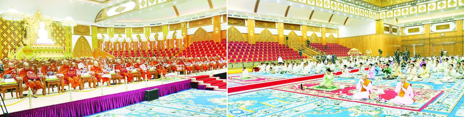 ထို့နောက် အခမ်းအနားကို “နမောတဿ” သုံးကြိမ်ရွတ်ဆို ဘုရားကန်တော့ဖွင့်လှစ်၍ နိုင်ငံတော်စီမံအုပ်ချုပ်ရေးကောင်စီဥက္ကဋ္ဌ နိုင်ငံတော်ဝန်ကြီးချုပ်နှင့်ဇနီးအမှူးပြုသော ဧည့်ပရိသတ်များက နိုင်ငံတော်သံဃမဟာနာယကအဖွဲ့ဥက္ကဋ္ဌ သန်လျင်မင်းကျောင်းဆရာတော်ဘုရားကြီးထံမှ ငါးပါးသီလခံယူဆောက်တည်ကြပြီး သံဃာတော်အရှင်သူမြတ်များ ရွတ်ပွားသရဇ္ဈာယ်တော်မူသော မေတ္တသုတ်ပရိတ်တရားတော်များကို နာယူကြည်ညိုကြသည်။