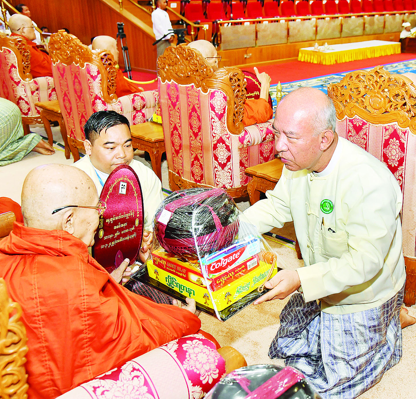 ယင်းနောက် နိုင်ငံတော်စီမံအုပ်ချုပ်ရေးကောင်စီဥက္ကဋ္ဌ နိုင်ငံတော်ဝန်ကြီးချုပ်နှင့်ဇနီးတို့က နိုင်ငံတော်သံဃမဟာ နာယကအဖွဲ့ဥက္ကဋ္ဌ၊ သန်လျင်မင်းကျောင်း ဆရာတော်ဘုရားကြီးထံသို့ လည်းကောင်း၊ ကောင်စီဒုတိယဥက္ကဋ္ဌ ဒုတိယဝန်ကြီးချုပ်နှင့်ဇနီးတို့က နိုင်ငံတော်သံဃမဟာနာယကအဖွဲ့ အကျိုးတော်ဆောင် မန္တလေးမြို့ မစိုးရိမ်တိုက်သစ် မဟာနာယကဆရာတော်ကြီးထံသို့ လည်းကောင်း၊ ကောင်စီအတွင်းရေးမှူးနှင့်ဇနီး၊ တွဲဖက်အတွင်းရေးမှူးနှင့်ဇနီး၊ ကောင်စီအဖွဲ့ဝင်များနှင့်ဇနီးများ၊ အခမ်းအနားသို့ တက်ရောက်လာသည့်အကြီးအကဲများက သာသနာတော်ဆိုင်ရာ ဘွဲ့တံဆိပ်တော်ဆက်ကပ်ခံယူမည့် ဆရာတော်ကြီးများထံသို့လည်းကောင်း လှူဖွယ်ဝတ္ထုပစ္စည်းများကို ဆက်ကပ်လှူဒါန်းကြသည်။
