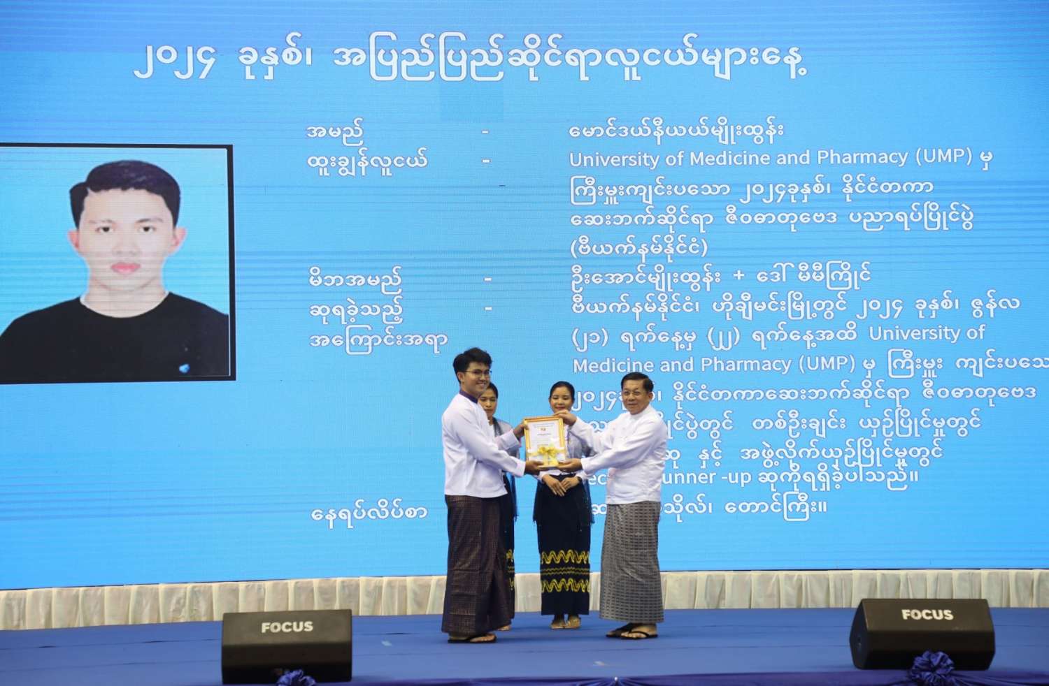 ယင်းနောက် နိုင်ငံတော်စီမံအုပ်ချုပ်ရေးကောင်စီဥက္ကဋ္ဌ နိုင်ငံတော်ဝန်ကြီးချုပ်က အပြည်ပြည်ဆိုင်ရာပြိုင်ပွဲများတွင် ရွှေတံဆိပ်ဆုရ ထူးချွန်လူငယ်များအား ဂုဏ်ပြုဆုများ ပေးအပ်ချီးမြှင့်သည်။ ထို့နောက် မြန်မာနိုင်ငံလူငယ်ရေးရာဗဟိုကော်မတီဥက္ကဋ္ဌ၊ အားကစားနှင့် လူငယ်ရေးရာဝန်ကြီးဌာန ပြည်ထောင်စုဝန်ကြီး ဦးမင်းသိန်းဇံက နိုင်ငံတော်စီမံအုပ်ချုပ်ရေးကောင်စီဥက္ကဋ္ဌ နိုင်ငံတော်ဝန်ကြီးချုပ်ထံ အပြည်ပြည်ဆိုင်ရာ လူငယ်များနေ့ အထိမ်းအမှတ်လက်ဆောင်အား ဂါရဝပြုပေးအပ်သည်။