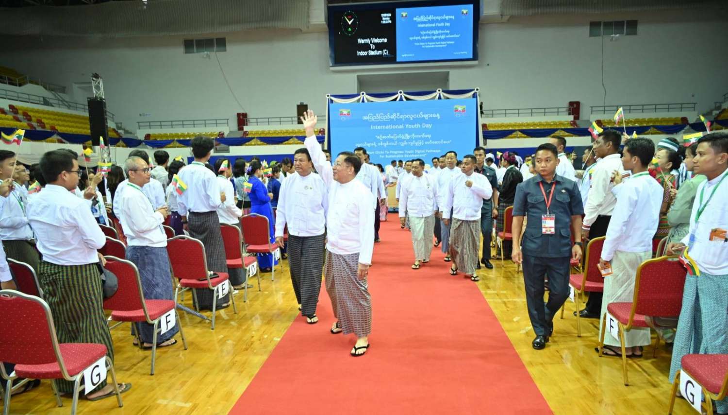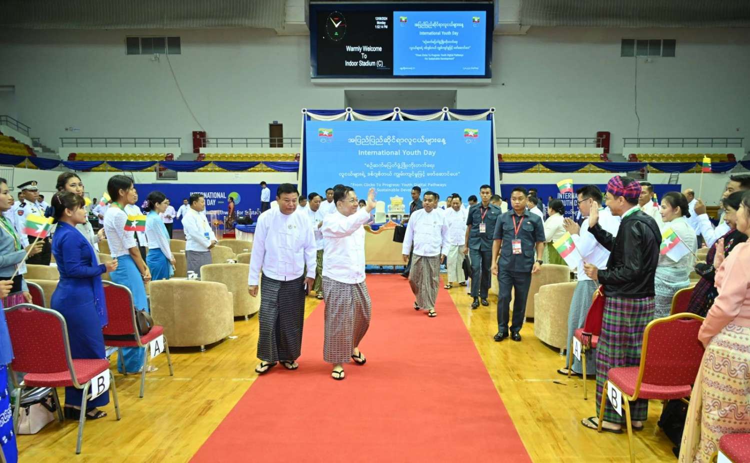 ၂၀၂၄ ခုနှစ်၊ အပြည်ပြည်ဆိုင်ရာ လူငယ်များနေ့အခမ်းအနားကို ယနေ့မွန်းလွဲပိုင်းတွင် နေပြည်တော်ရှိ ဝဏ္ဏသိဒ္ဓိအားကစားရုံ(C)၌ ကျင်းပပြုလုပ်ရာ နိုင်ငံတော်စီမံအုပ်ချုပ်ရေးကောင်စီဥက္ကဋ္ဌ နိုင်ငံတော်ဝန်ကြီးချုပ် ဗိုလ်ချုပ်မှူးကြီး မင်အောင်လှိုင် တက်ရောက်အမှာစကားပြောကြားသည်။