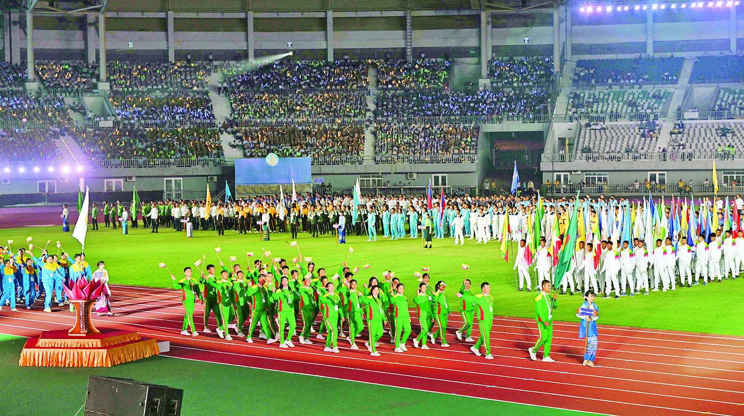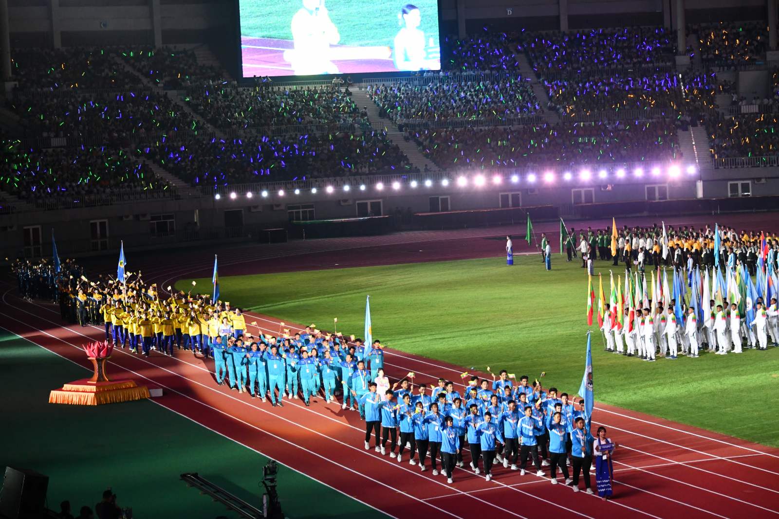 ထို့နောက် နိုင်ငံတော်စစ်တီးဝိုင်းက ကွင်းအတွင်းနေရာယူပြီး အလံတော်အဖွဲ့ ဦးဆောင်၍ ဝန်ကြီးဌာနများ၊ တိုင်းဒေသကြီးနှင့် ပြည်နယ်များမှ ပြိုင်ပွဲဝင်အားကစားအသင်းများ ကွင်းအတွင်းသို့ ဝင်ရောက်ချီတက်နေရာယူကြကာ နိုင်ငံတော်အလံကို လွှင့်တင်၍ အလေးပြုကြသည်။