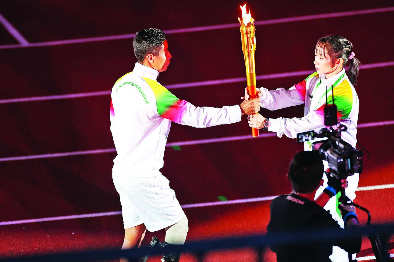 ယင်းနောက် မြန်မာ့အားကစားရွှေခေတ်ကာလ နိုင်ငံ့ဂုဏ်ဆောင်နိုင်ခဲ့သည့် အားကစားသမားဟောင်းကြီးများက အမျိုးသားအားကစားပွဲတော်အလံကို ကွင်းအတွင်းသို့ သယ်ဆောင်လာပြီး အလံကိုလွှင့်တင်ကြသည်။