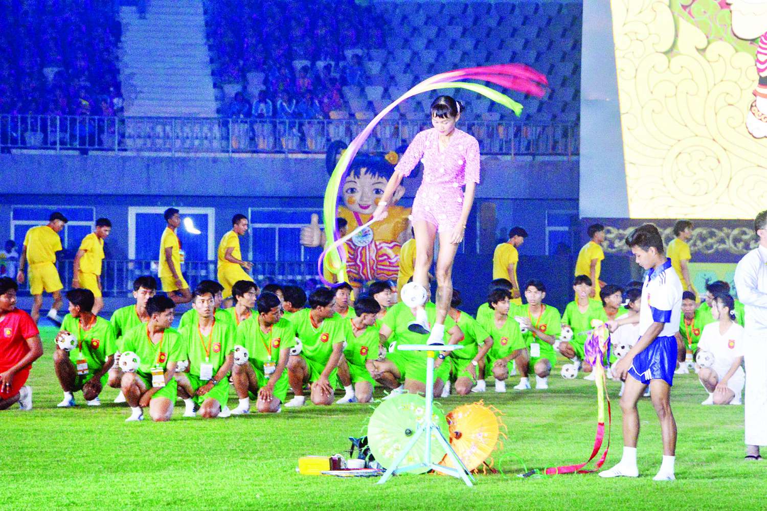 ထို့နောက် ၂ဝ၂၄ခုနှစ်၊ ပဉ္စမအကြိမ်မြောက် အမျိုးသားအားကစားပွဲတော်ဖွင့်ပွဲ အခမ်းအနားအောင်မြင်ခြင်းအထိမ်းအမှတ်အဖြစ် မီးရှူးမီးပန်းများကို ပစ်ဖောက်ပြီး နိုင်ငံတော်စီမံအုပ်ချုပ်ရေးကောင်စီဥက္ကဋ္ဌ နိုင်ငံတော်ဝန်ကြီးချုပ်နှင့်ဇနီးတို့သည် အခမ်းအနားတက်ရောက်လာကြသူများအား လက်ပြနှုတ်ဆက်ခဲ့ကြပြီး နိုင်ငံ့ဂုဏ်ဆောင်ခဲ့ကြသည့် အားကစားသမားဟောင်းကြီးများနှင့် အနုပညာရှင်များအား ရင်းရင်းနှီးနှီး နှုတ်ဆက်ခဲ့ကြသည်။