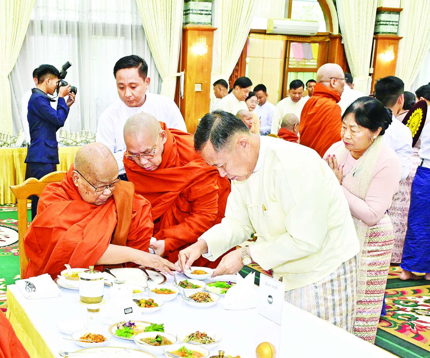 အခမ်းအနားအပြီးတွင် နိုင်ငံတော်စီမံအုပ်ချုပ်ရေးကောင်စီဥက္ကဋ္ဌ တပ်မတော်ကာကွယ်ရေးဦးစီးချုပ်နှင့် ဇနီး၊ နိုင်ငံတော်စီမံအုပ်ချုပ်ရေးကောင်စီ ဒုတိယဥက္ကဋ္ဌ ဒုတိယတပ်မတော်ကာကွယ်ရေးဦးစီးချုပ်ကာကွယ်ရေးဦးစီးချုပ် (ကြည်း) နှင့် ဇနီး၊ အခမ်းအနားတက်ရောက်လာကြသည့် တပ်မတော်အရာရှိကြီးများသည် သန်လျင်မင်းကျောင်းဆရာတော်ကြီး အမှူးပြုသည့် ဆရာတော်၊ သံဃာတော်များအား နေ့ဆွမ်းဆက်ကပ်လှူဒါန်းခဲ့ကြောင်း သတင်းရရှိသည်။