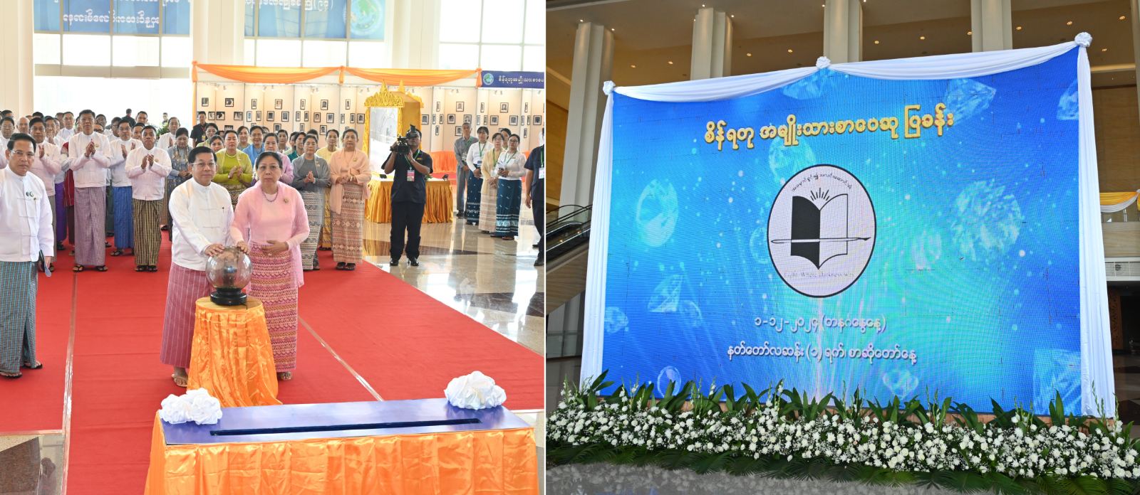ဦးစွာ နိုင်ငံတော်စီမံအုပ်ချုပ်ရေးကောင်စီဥက္ကဋ္ဌ နိုင်ငံတော်ဝန်ကြီးချုပ်နှင့် ဇနီးတို့က စိန်ရတုအမျိုးသားစာပေဆု အထိမ်းအမှတ်ပြခန်းအား စက်ခလုတ်နှိပ်ဖွင့်လှစ်ပေးသည်။