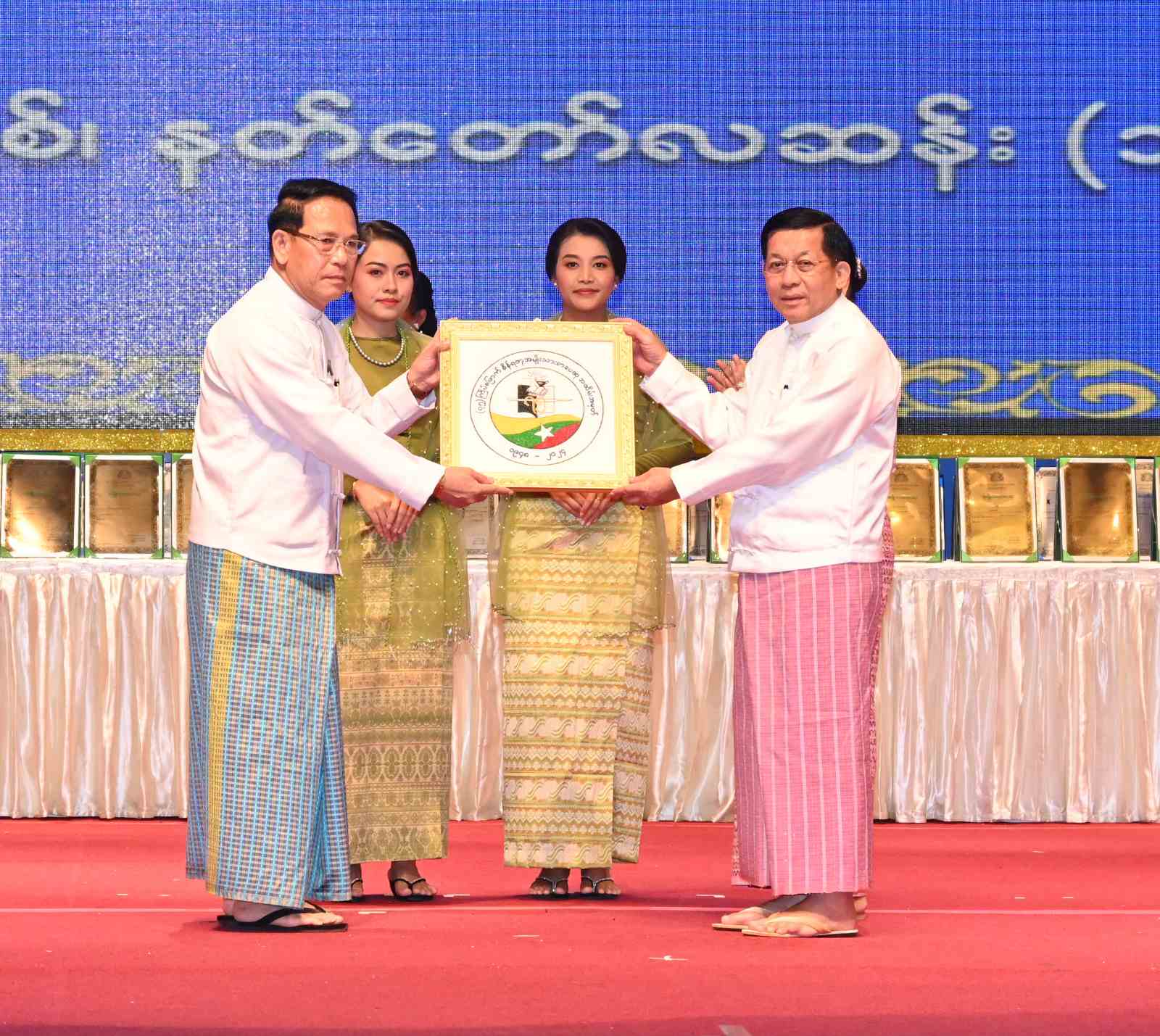 (၇၅) ကြိမ်မြောက် စိန်ရတုအမျိုးသားစာပေဆုအထိမ်းအမှတ် ၂ဝ၂၃ ခုနှစ်အတွက် အမျိုးသားစာပေတစ်သက်တာဆု၊ အမျိုးသားစာပေဆုနှင့် စာပေဗိမာန်စာမူဆု ဆုနှင်းသဘင်အခမ်းအနားကျင်းပ နိုင်ငံတော်စီမံအုပ်ချုပ်ရေးကောင်စီဥက္ကဋ္ဌ နိုင်ငံတော်ဝန်ကြီးချုပ် ဗိုလ်ချုပ်မှူးကြီး မင်းအောင်လှိုင်နှင့် ဇနီး ဒေါ်ကြူကြူလှ တက်ရောက်ချီးမြှင့်ပေးအပ်