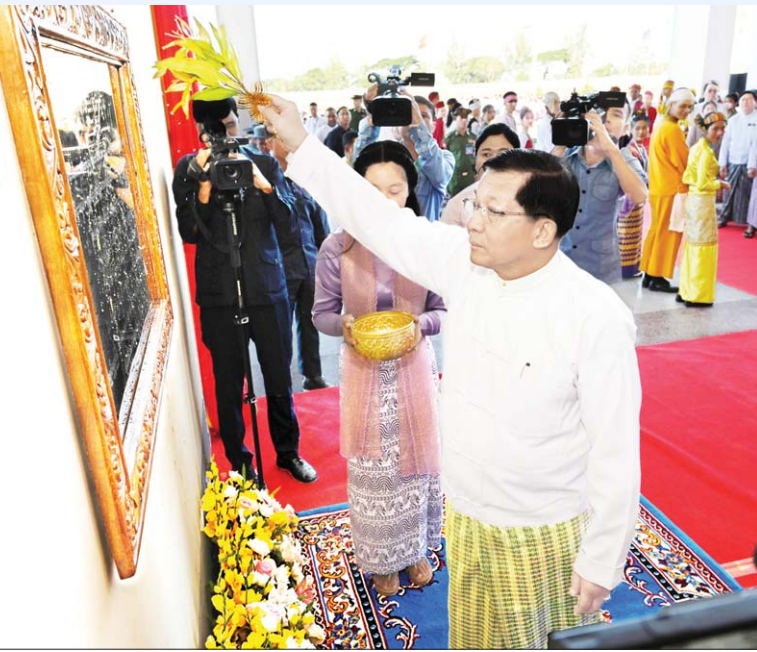 ၎င်းနောက် နိုင်ငံတော်ယာယီသမ္မတ နိုင်ငံတော်လုံခြုံရေးနှင့်အေးချမ်းသာယာရေးကော်မရှင်ဥက္ကဋ္ဌနှင့် အဖွဲ့ဝင်များက ပင်မအဆောက်အဦ ကမ္ပည်းမော်ကွန်းအား အမွှေးနံ့သာရည်များဖြင့် ပက်ဖျန်းပေးသည်။