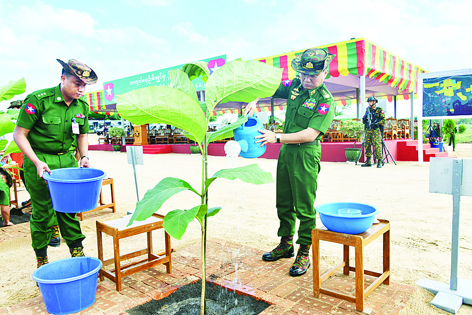 နိုင်ငံတော်စီမံအုပ်ချုပ်ရေးကောင်စီဥက္ကဋ္ဌ တပ်မတော်ကာကွယ်ရေးဦးစီးချုပ်နှင့်ဇနီး တို့က ရတနာတန်းဝင် ကျွန်းပင်ကို ဦးဆောင်စိုက်ပျိုး