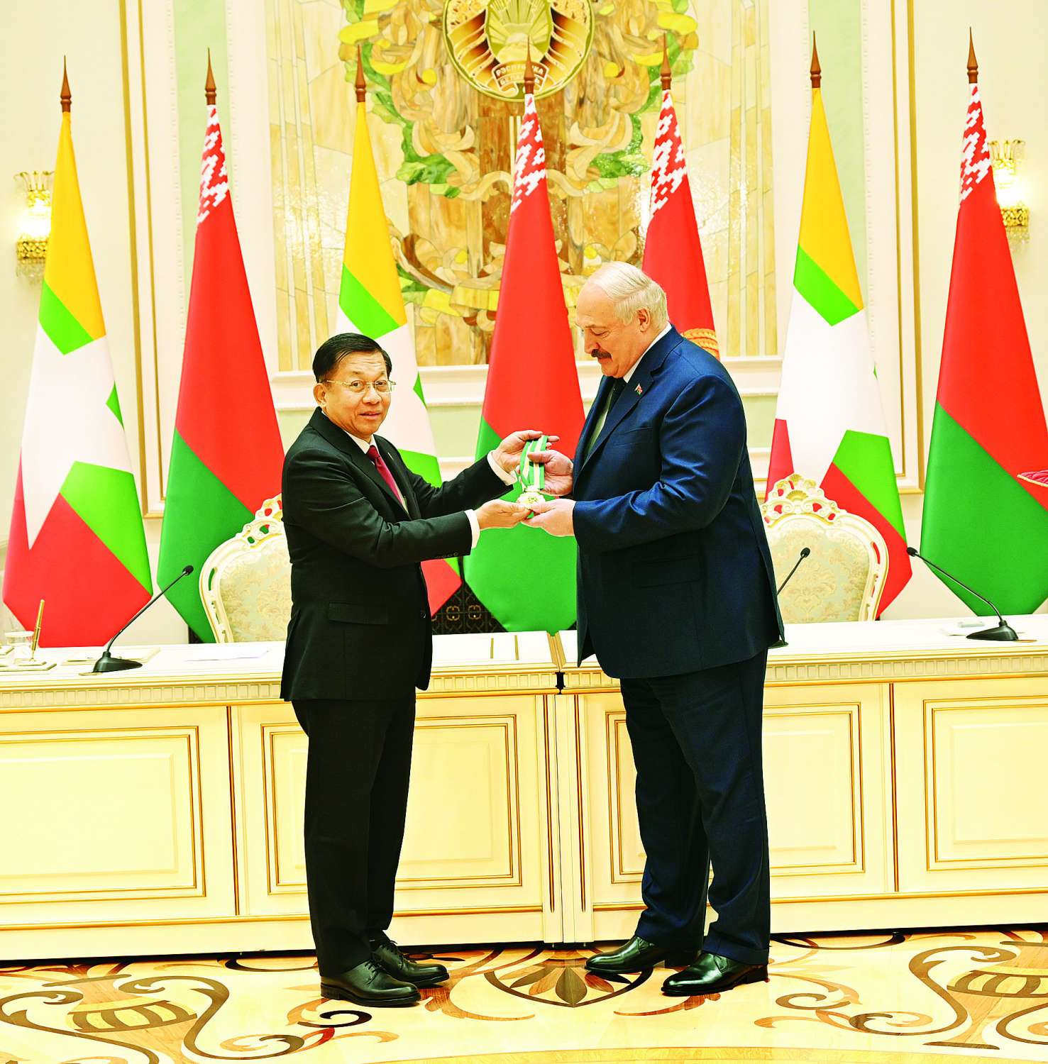 ဆက်လက်၍ နိုင်ငံတော်စီမံအုပ်ချုပ်ရေးကောင်စီဥက္ကဋ္ဌ နိုင်ငံတော်ဝန်ကြီးချုပ် ဗိုလ်ချုပ်မှူးကြီး မင်းအောင်လှိုင်သည် ဘယ်လာရုစ်သမ္မတနိုင်ငံ သမ္မတ H.E. Mr. Alexander Gregor-yevich Lukashenko အား အဂ္ဂမဟာသရေစည်သူဘွဲ့ကို ချီးမြှင့်အပ်နှင်းသည်။