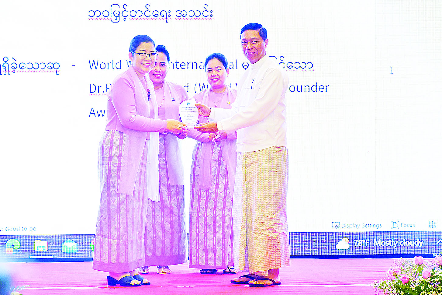 ထို့နောက် မြန်မာနိုင်ငံလုံးဆိုင်ရာ အမျိုးသမီးကော်မတီဥက္ကဋ္ဌ ပြည်ထောင်စုဝန်ကြီး ဒေါက်တာ စိုးဝင်းက ကချင်ပြည်နယ်မှ World Vision Inter-national Founder Award ရရှိသူကို ဆုချီးမြှင့်သည်။