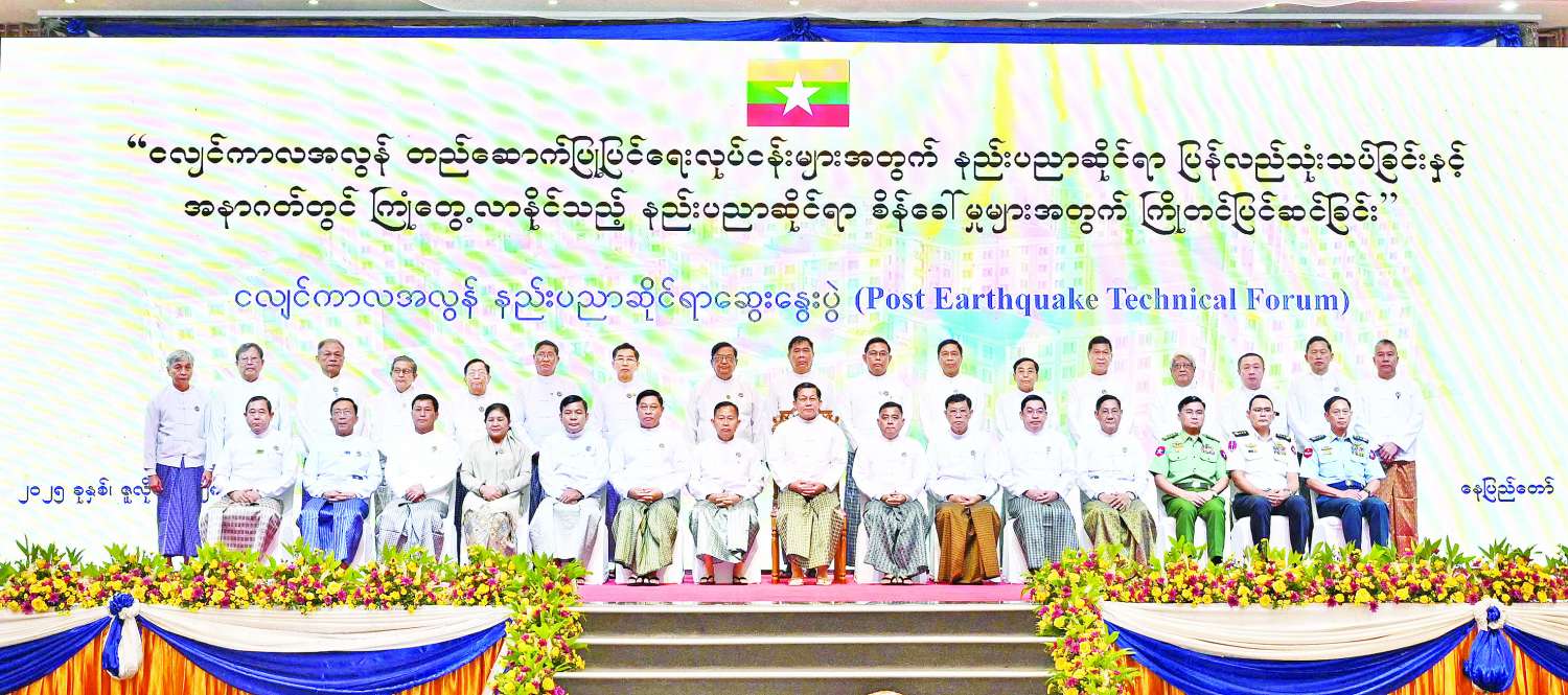 “ငလျင်ကာလအလွန် တည်ဆောက်ပြုပြင်ရေးလုပ်ငန်းများအတွက် နည်းပညာဆိုင်ရာ ပြန်လည်သုံးသပ်ခြင်းနှင့် အနာဂတ်တွင် ကြုံတွေ့လာနိုင်သည့် နည်းပညာဆိုင်ရာ စိန်ခေါ်မှုများအတွက် ကြိုတင်ပြင်ဆင်ခြင်း” ခေါင်းစဉ်ဖြင့် ကျင်းပပြုလုပ်သည့် ငလျင်ကာလအလွန် နည်းပညာဆိုင်ရာဆွေးနွေးပွဲ (Post Earthquake Technical Forum) ဖွင့်ပွဲအခမ်းအနားကို ယနေ့နံနက်ပိုင်းတွင် နေပြည်တော်ရှိ မင်္ဂလာသီရိဟိုတယ်၌ ကျင်းပပြုလုပ်ရာ နိုင်ငံတော်စီမံအုပ်ချုပ်ရေးကောင်စီဥက္ကဋ္ဌ နိုင်ငံတော်ဝန်ကြီးချုပ် ဗိုလ်ချုပ်မှူးကြီး မင်းအောင်လှိုင် တက်ရောက်၍ အဖွင့်အမှာစကား ပြောကြားသည်။