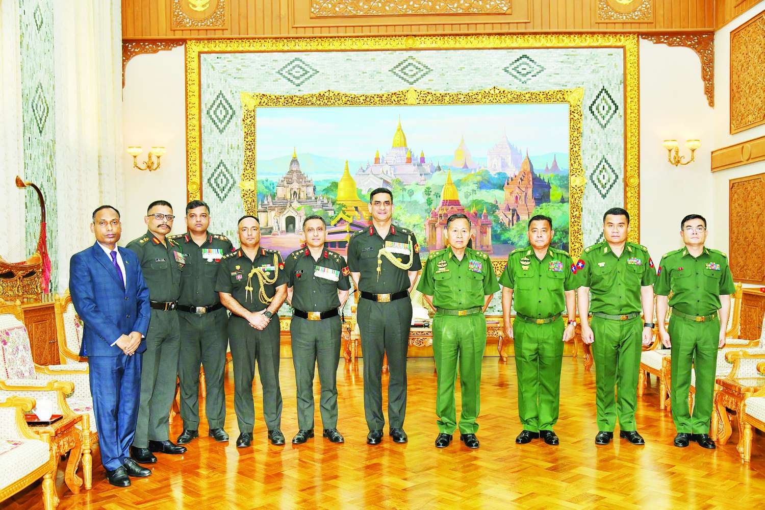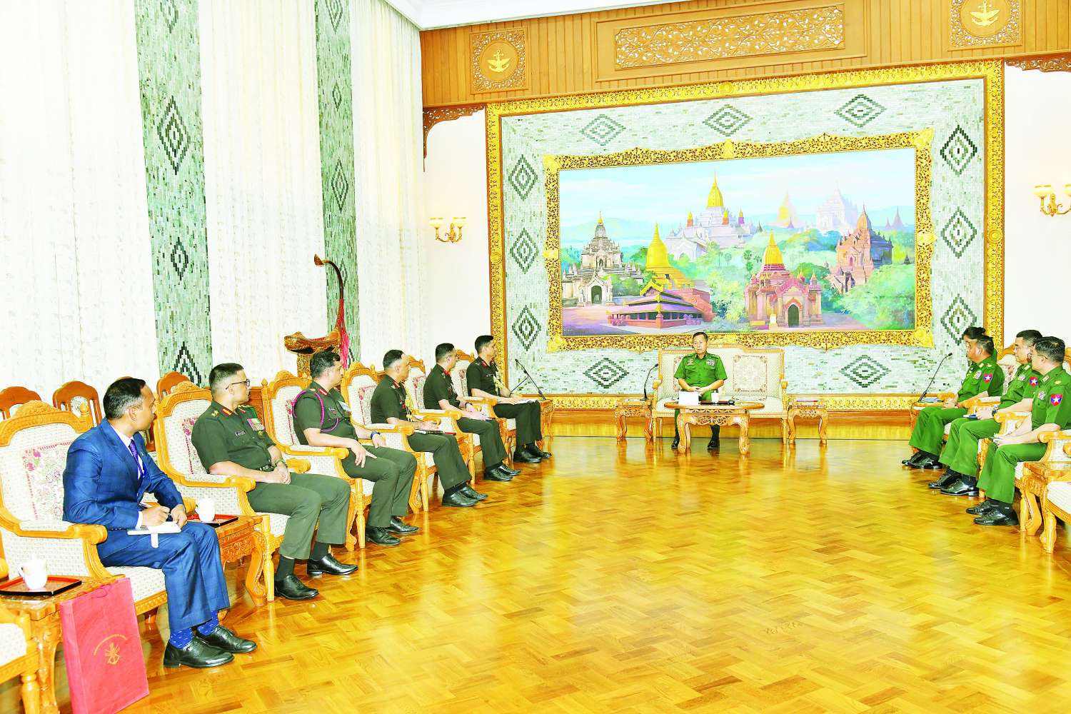 နိုင်ငံတော်စီမံအုပ်ချုပ်ရေးကောင်စီ ဒုတိယဥက္ကဋ္ဌ ဒုတိယတပ်မတော်ကာကွယ်ရေးဦးစီးချုပ် ကာကွယ်ရေးဦးစီးချုပ် (ကြည်း) ဒုတိယဗိုလ်ချုပ်မှူးကြီး စိုးဝင်း အိန္ဒိယတပ်မတော်ကာကွယ်ရေးဆိုင်ရာ ထောက်လှမ်းရေးညွှန်ကြားရေးမှူးချုပ်နှင့် ဒုတိယစစ်ဦးစီးချုပ် (ထောက်လှမ်းရေး) ဦးဆောင်သော ကိုယ်စားလှယ်အဖွဲ့အား လက်ခံတွေ့ဆုံ