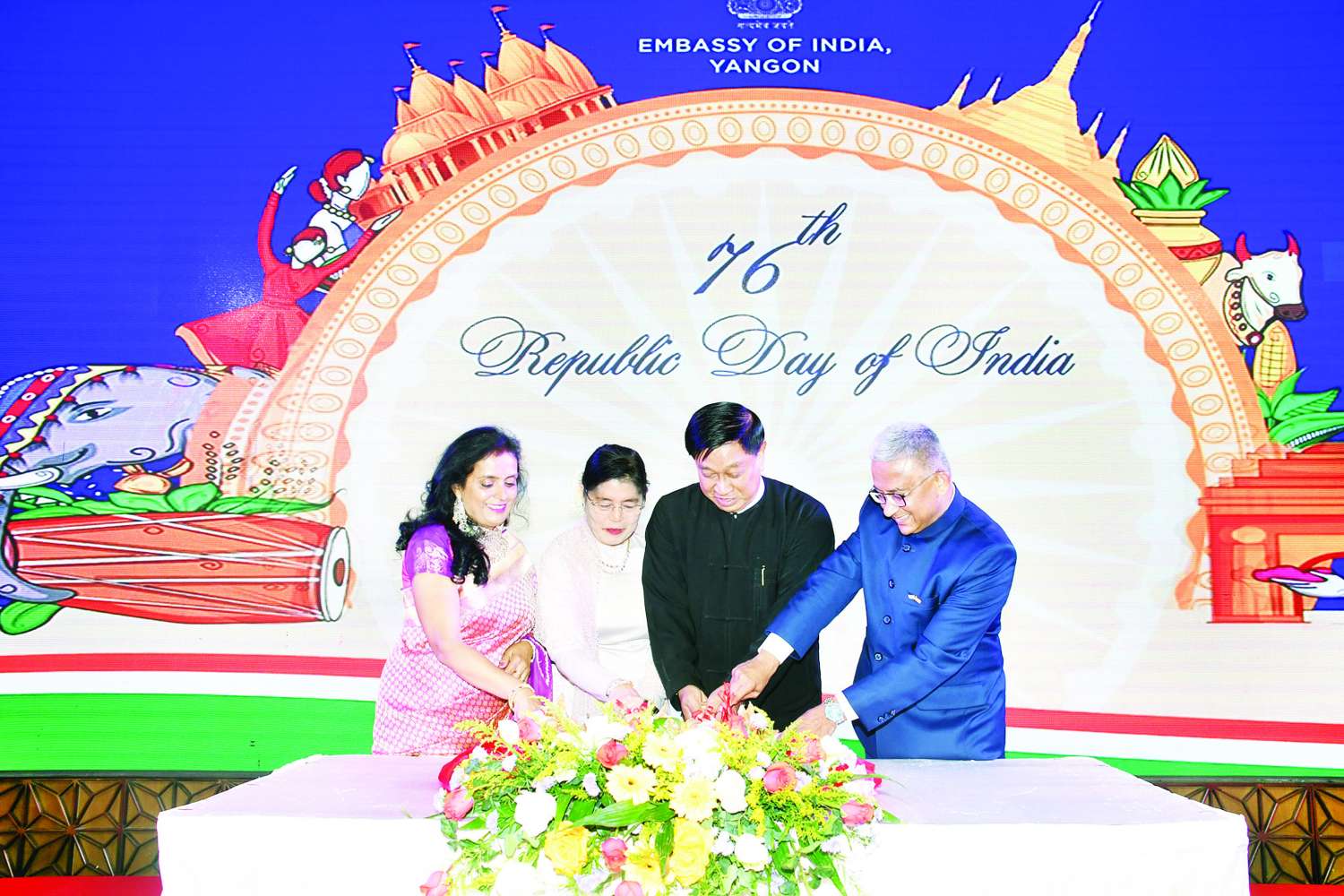 ထို့နောက် ဒုတိယဝန်ကြီးချုပ်နှင့် ပြည်ထောင်စုဝန်ကြီး ဗိုလ်ချုပ်ကြီး တင်အောင်စန်းနှင့် ဇနီး၊ မြန်မာနိုင်ငံဆိုင်ရာ အိန္ဒိယနိုင်ငံသံအမတ်ကြီး H.E.Mr.Abhay Thakurနှင့် ဇနီးတို့သည် အိန္ဒိယသမ္မတနိုင်ငံ၏ (၇၆) နှစ်မြောက် အမျိုးသားနေ့အထိမ်းအမှတ် ကိတ်မုန့်ကို လှီးဖြတ်ပေးကြသည်။