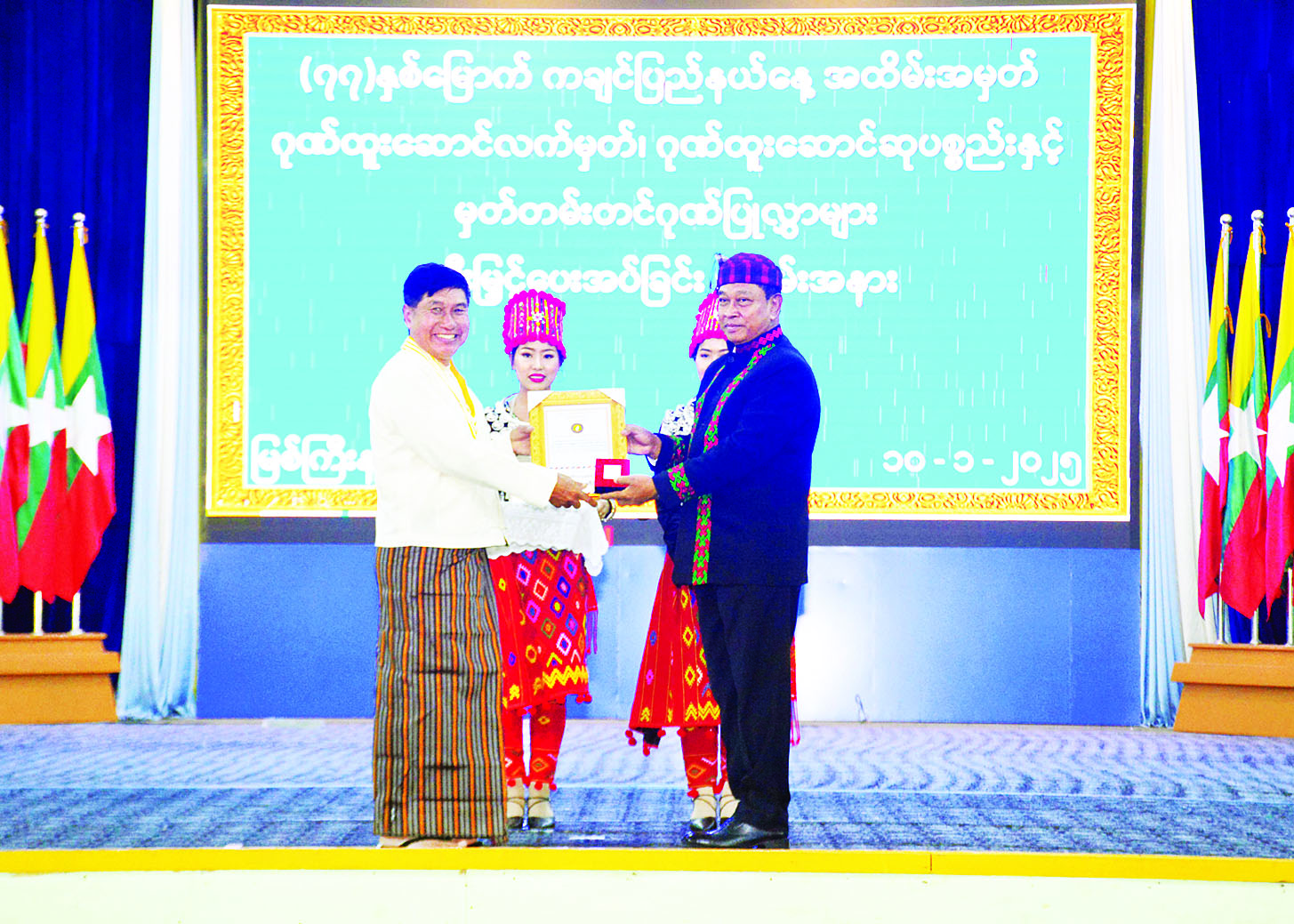 နိုင်ငံတော်စီမံအုပ်ချုပ်ရေးကောင်စီအဖွဲ့ဝင်၊ ဒုတိယဝန်ကြီးချုပ်နှင့် ပြည်ထောင်စုဝန်ကြီး ဗိုလ်ချုပ်ကြီးတင်အောင်စန်းနှင့် အဖွဲ့ဝင်များ (၇၇)နှစ်မြောက် ကချင်ပြည်နယ်နေ့အထိမ်းအမှတ် သဝဏ်လွှာဖတ်ပွဲ၊ ဂုဏ်ထူးဆောင်လက်မှတ်၊ ဂုဏ်ထူးဆောင်ဆုပစ္စည်းများနှင့် မှတ်တမ်းတင်ဂုဏ်ပြုလွှာချီးမြှင့်ပေးအပ်ခြင်းအခမ်းအနားသို့ တက်ရောက်