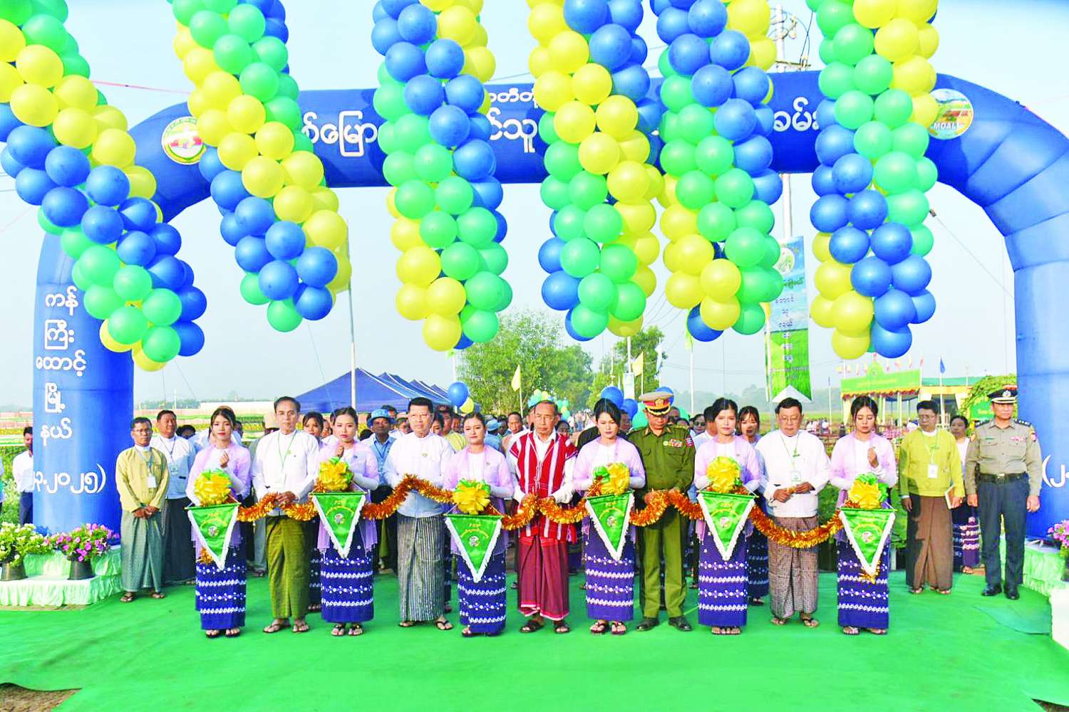 ဦးစွာ တောင်သူလယ်သမားနေ့အခမ်းအနား မုခ်ဦးဆိုင်းဘုတ်ကို နိုင်ငံတော်စီမံအုပ်ချုပ်ရေးကောင်စီအဖွဲ့ဝင်၊ တိုင်းဒေသကြီးဝန်ကြီးချုပ်၊ တိုင်းဒေသကြီး လုံခြုံရေးနှင့် နယ်စပ်ရေးရာ ဝန်ကြီး၊ စီးပွားရေးရာဝန်ကြီး၊ စိုက်ပျိုးရေးဦးစီးဌာန ဒုတိယညွှန်ကြားရေးမှူးချုပ်တို့က ဖဲကြိုးဖြတ်ဖွင့်လှစ်ပေးကာ စုပေါင်းမှတ်တမ်းတင် ဓာတ်ပုံရိုက်ကြပြီး ဖျော်ဖြေရေးအဖွဲ့များအား ဂုဏ်ပြုချီးမြှင့်ငွေပေးအပ်သည်။