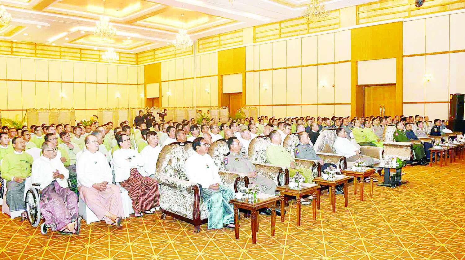 စက်တင်ဘာ ၁၀ ရက်မှ ၁၂ ရက်အထိ ရာဂီတိုင်ဖွန်းမုန်တိုင်း အရှိန်ကြောင့် နေပြည်တော်၊ တိုင်းဒေသကြီးနှင့် ပြည်နယ်အချို့တွင် ရေကြီးရေလျှံမှုများ ဖြစ်ပေါ်ခဲ့ရာ အထွေထွေအုပ်ချုပ်ရေးဦးစီးဌာန ဝန်ထမ်းများသည် သက်ဆိုင်ရာ ခရိုင်/ မြို့နယ်သဘာဝဘေး အန္တရာယ်ဆိုင်ရာ စီမံခန့်ခွဲမှုအဖွဲ့များနှင့်အတူ ထဲထဲဝင်ဝင် ပူးပေါင်းဆောင်ရွက်နိုင်ခဲ့သည့်အပေါ် ဌာနအနေဖြင့် များစွာဂုဏ်ယူရမည်ဖြစ်ကြောင်း ယခုနှစ် အောက်တိုဘာ ၁ ရက်မှ ၁၅ ရက် အထိ လူဦးရေနှင့် အိမ်အကြောင်းအရာ ကိန်းဂဏန်း၊ အချက်အလက်များကို နိုင်ငံတစ်ဝန်း တစ်ပြိုင်တည်း ကွင်းဆင်းကောက်ယူခဲ့ရာတွင် အထွေထွေအုပ်ချုပ်ရေးဦးစီးဌာန ဝန်ထမ်းများက သက်ဆိုင်ရာ ဌာန/ အဖွဲ့အစည်းများနှင့် ပူးပေါင်းပါဝင်ပြီး အောင်မြင်အောင် ဆောင်ရွက်နိုင်ခဲ့သည်ကိုလည်း တွေ့မြင်ကြရမည်ဖြစ်ကြောင်း၊ နိုင်ငံတော်က ချမှတ်ထားသည့် အမျိုးသားရေး ရည်မှန်းချက် (၂) ရပ်၊ နိုင်ငံရေးရည်မှန်းချက် (၂) ရပ်၊ ရှေ့လုပ်ငန်းစဉ် (၅) ရပ်နှင့် ဦးတည်ချက် (၉) ရပ်တို့ကို “မူဝါဒ” အဖြစ်ခံယူပြီး ကျရာအခန်းကဏ္ဍမှ စိတ်ရင်းစေတနာအမှန်ဖြင့် အကောင်အထည်ဖော် ဆောင်ရွက်ကြ ရန်ဖြစ်ကြောင်း၊ လွတ်လပ်ပြီး တရားမျှတသည့် အထွေထွေရွေးကောက်ပွဲကြီး အောင်မြင်စွာကျင်းပနိုင်ရေးအတွက် အရာထမ်း၊ အမှုထမ်းများအနေဖြင့် လိုအပ်သည့်အခန်းကဏ္ဍမှ ပါဝင်၍ ပူးပေါင်းဆောင်ရွက်သွားကြရန်ဖြစ်ကြောင်း၊ နိုင်ငံ့အကျိုးကို အစဉ်သယ်ပိုးနိုင်ပြီး အရည်အသွေးပြည့်ဝသည့် အုပ်ချုပ်ရေးဝန်ထမ်းကောင်းများဖြစ်အောင် ကြိုးပမ်း ဆောင်ရွက်စေလိုကြောင်း ပြောကြားသည်။