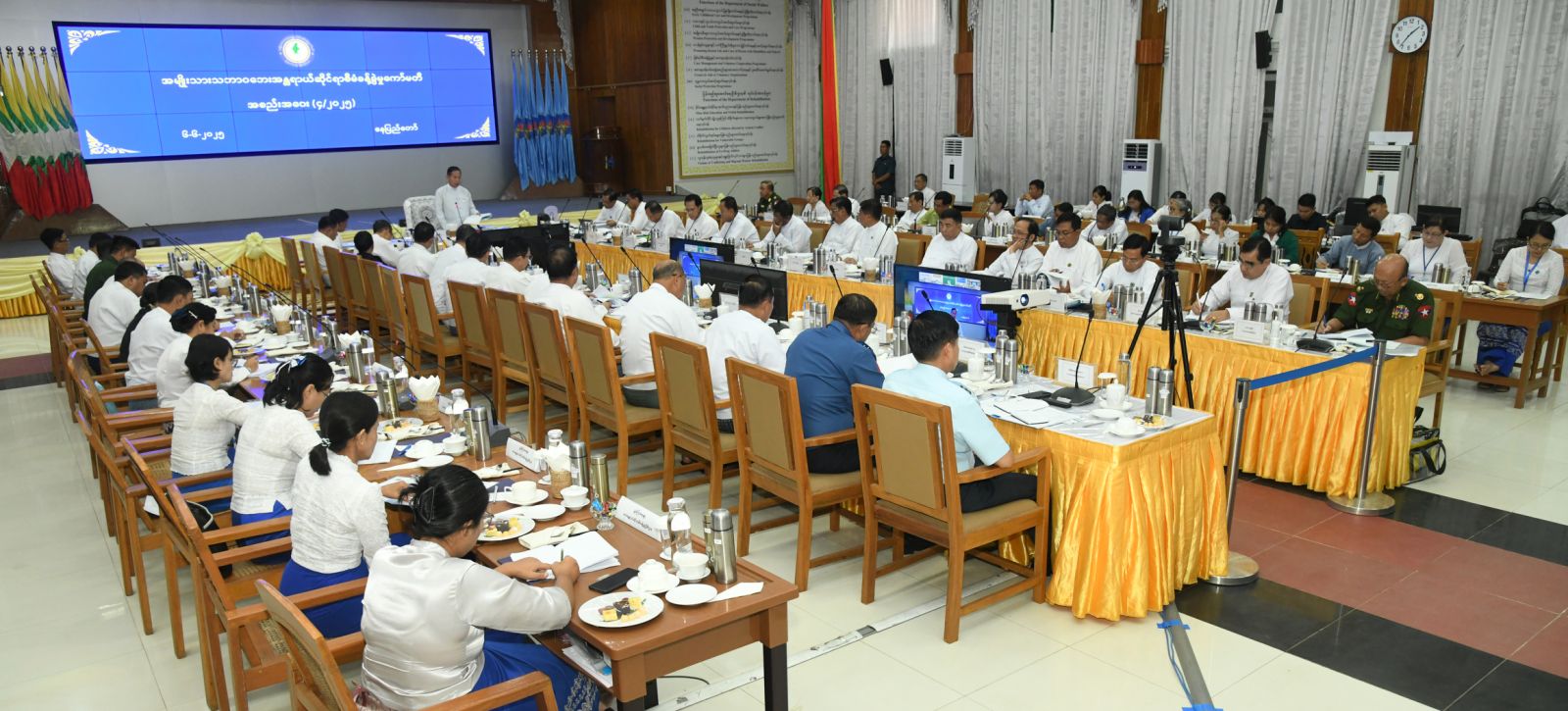 အစည်းအဝေးသို့ အဆောက်အဦများ ပြန်လည်ပြုပြင်အသုံးပြုရေးနှင့် အသစ်တည်ဆောက်ရေး ကြီးကြပ်မှုကော်မတီဥက္ကဋ္ဌ၊ နိုင်ငံတော်စီမံအုပ်ချုပ်ရေးကောင်စီအဖွဲ့ဝင်၊ ကာကွယ်ရေးဝန်ကြီးဌာန ပြည်ထောင်စုဝန်ကြီး ဗိုလ်ချုပ်ကြီး မောင်မောင်အေး၊ ကော်မတီဒုတိယဥက္ကဋ္ဌများနှင့် ကော်မတီဝင်ပြည်ထောင်စုဝန်ကြီးများ၊ နေပြည်တော်ကောင်စီဥက္ကဋ္ဌ၊ ကာကွယ်ရေးဦးစီးချုပ်ရုံးမှ တပ်မတော်အရာရှိကြီးများ၊ ဒုတိယဝန်ကြီးများ၊ ဌာနဆိုင်ရာအကြီးအကဲများနှင့် တာဝန်ရှိသူများတက်ရောက်ကြပြီး စစ်ကိုင်းတိုင်းဒေသကြီး၊ ပဲခူးတိုင်းဒေသကြီး၊ မန္တလေးတိုင်းဒေသကြီးနှင့် ရှမ်းပြည်နယ်တို့မှ ဝန်ကြီးချုပ်များက ဗီဒီယိုကွန်ဖရင့်ဖြင့် တက်ရောက်ကြသည်။