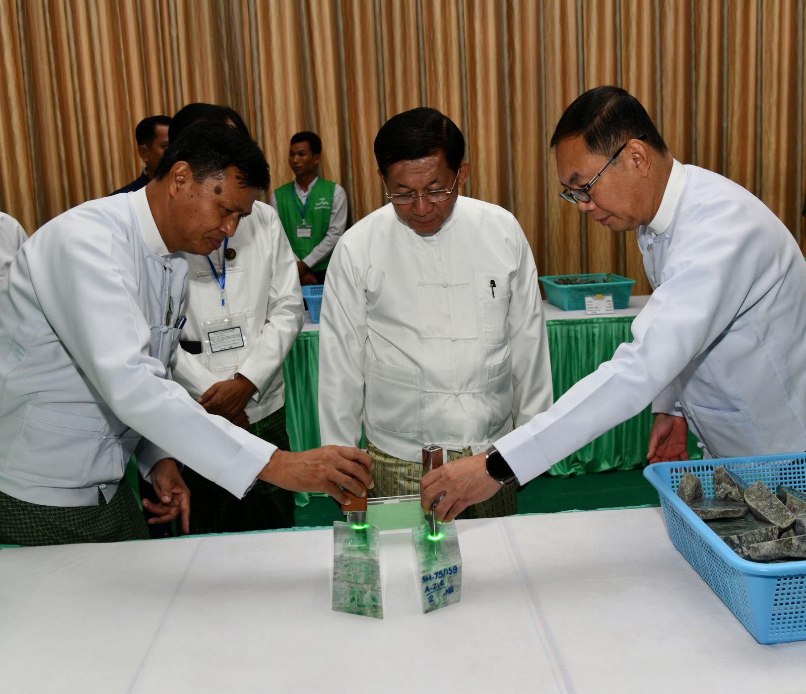 ထို့နောက် နိုင်ငံတော်စီမံအုပ်ချုပ်ရေးကောင်စီဥက္ကဋ္ဌ နိုင်ငံတော်ဝန်ကြီးချုပ်နှင့် အဖွဲ့ဝင်များသည် ပုဂ္ဂလိက ကျောက်မျက်ရတနာ အချောထည် အရောင်းပြခန်းများ ဖွင့်လှစ်ရောင်းချနေမှုကို လိုက်လံ ကြည့်ရှု အားပေးပြီး ခန်းမအပြင်ဘက်တွင် ခင်းကျင်းပြသထားသည့် ကျောက်စိမ်းရိုင်းအတွဲများကို လိုက်လံကြည့်ရှု စစ်ဆေးသည်။