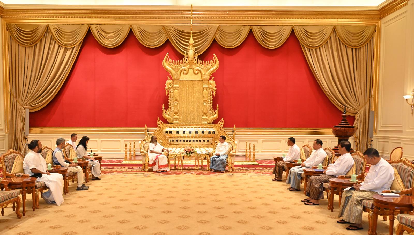 နိုင်ငံတော်စီမံအုပ်ချုပ်ရေးကောင်စီဥက္ကဋ္ဌ နိုင်ငံတော်ဝန်ကြီးချုပ် ဗိုလ်ချုပ်မှူးကြီး မင်းအောင်လှိုင် အိန္ဒိယနိုင်ငံမှ လူသားချင်းစာနာထောက်ထားမှု ခေါင်းဆောင်နှင့် ငြိမ်းချမ်းရေးသံတမန်ကြီး Gurudev Sri Sri Ravi Shankar အား ယနေ့နံနက်ပိုင်းတွင် နေပြည်တော်ရှိ နိုင်ငံတော်စီမံအုပ်ချုပ်ရေးကောင်စီဥက္ကဋ္ဌရုံး၊ သံတမန်ဆောင်ဧည့်ခန်းမ၌ လက်ခံတွေ့ဆုံသည်။