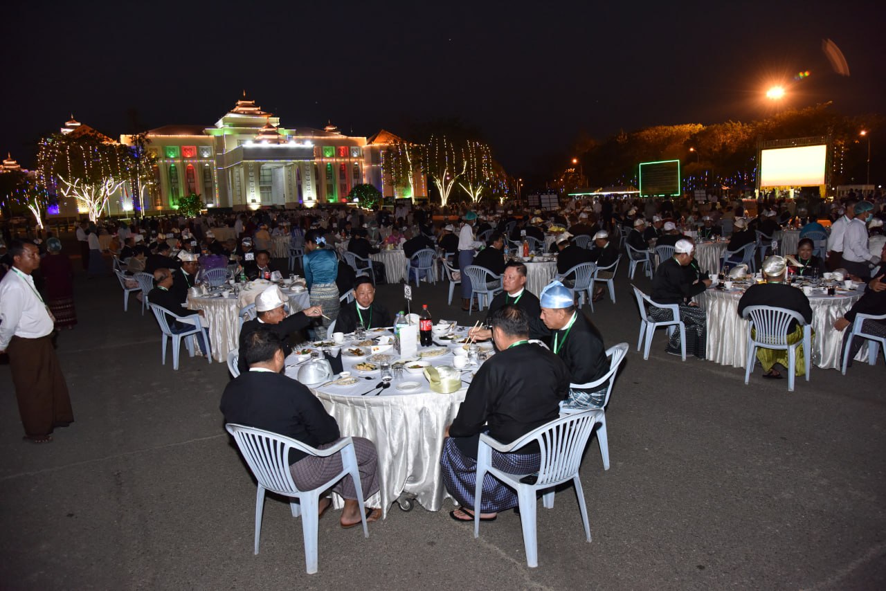 ဂုဏ်ပြုညစာစားပွဲသို့ နိုင်ငံတော်စီမံအုပ်ချုပ်ရေးကောင်စီအတွင်းရေးမှူးနှင့်ဇနီး၊ တွဲဖက်အတွင်းရေးမှူးနှင့်ဇနီး၊ ကောင်စီဝင်များနှင့်ဇနီးများ၊ နိုင်ငံတော်စီမံအုပ်ချုပ်ရေး ကောင်စီဗဟိုအကြံပေးအဖွဲ့ဝင်များ၊ အငြိမ်းစားတပ်မတော်အရာရှိကြီးများ၊ ပြည်ထောင်စုဝန်ကြီးများ၊ ပြည်ထောင်စုအဆင့်ပုဂ္ဂိုလ်များနှင့်ဇနီးများ၊ နေပြည်တော်ကောင်စီဥက္ကဋ္ဌ၊ ကာကွယ်ရေးဦးစီးချုပ်ရုံးမှ တပ်မတော်အရာရှိကြီးများနှင့်ဇနီးများ၊ နိုင်ငံတော်စီမံအုပ်ချုပ်ရေး ကောင်စီဥက္ကဋ္ဌ၏ အကြံပေးပုဂ္ဂိုလ်များ၊ နေပြည်တော်တိုင်းစစ်ဌာနချုပ်တိုင်းမှူး၊ ဒုတိယဝန်ကြီးများ၊ တိုင်းဒေသကြီးနှင့် ပြည်နယ်များမှ စီးပွားရေးရာဝန်ကြီးများနှင့် တိုင်းရင်းသားလူမျိုးရေးရာဝန်ကြီးများ၊ တစ်နိုင်ငံလုံးပစ်ခတ်တိုက်ခိုက်မှု ရပ်စဲရေးသဘောတူစာချုပ် (NCA) လက်မှတ်ရေးထိုးထားသည့် တိုင်းရင်းသားလက်နက်ကိုင်အဖွဲ့များမှ ခေါင်းဆောင်များနှင့် ကိုယ်စားလှယ်များ၊ နိုင်ငံရေးပါတီများမှ ဥက္ကဋ္ဌများနှင့် ကိုယ်စားလှယ်များ၊ ဌာနဆိုင်ရာတာဝန်ရှိသူများ၊ တိုင်းဒေသကြီးနှင့် ပြည်နယ်များမှ MSME လုပ်ငန်းရှင်များ၊ တိုင်းဒေသကြီးနှင့် ပြည်နယ်များမှ တိုင်းရင်းသားယဉ်ကျေးမှုအဖွဲ့များနှင့်ဖိတ်ကြားထားသည့် ဧည့်သည်တော်များ တက်ရောက်ခဲ့ကြကြောင်း သတင်းရရှိသည်။