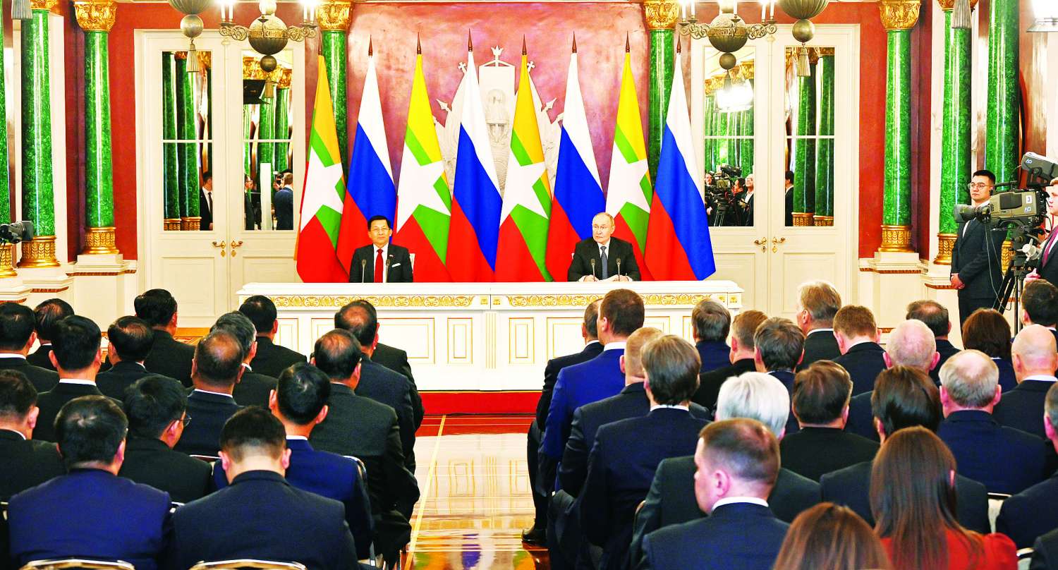 ရုရှားဖက်ဒရေးရှင်းနိုင်ငံသမ္မတ H.E. Vladimir Vladimirovich Putin ၏ ဖိတ်ကြားချက်အရ ရုရှားဖက်ဒရေးရှင်းနိုင်ငံသို့ တရားဝင်ချစ်ကြည်ရေးခရီး ရောက်ရှိနေသည့် နိုင်ငံတော်စီမံအုပ်ချုပ်ရေးကောင်စီဥက္ကဋ္ဌ နိုင်ငံတော်ဝန်ကြီးချုပ် ဗိုလ်ချုပ်မှူးကြီး မင်းအောင်လှိုင်သည် ယနေ့ ဒေသစံတော်ချိန် ညနေပိုင်းတွင် မော်စကိုမြို့၊ ကရင်မလင် နန်းတော်၌ ရုရှားဖက်ဒရေးရှင်းနိုင်ငံသမ္မတ H.E. Vladimir Vladimirovich Putin နှင့်သီးခြား တွေ့ဆုံဆွေးနွေးသည်။