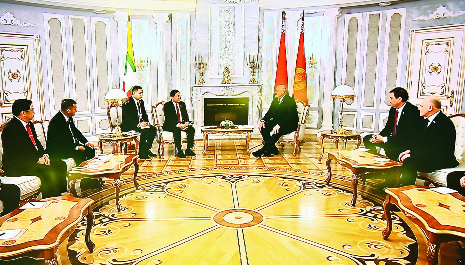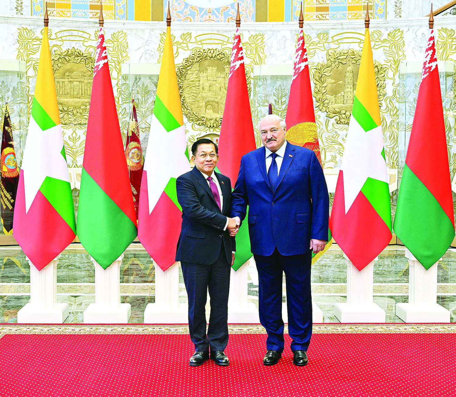 နိုင်ငံတော်စီမံအုပ်ချုပ်ရေးကောင်စီဥက္ကဋ္ဌ နိုင်ငံတော်ဝန်ကြီးချုပ် ဗိုလ်ချုပ်မှူးကြီး မင်းအောင်လှိုင်အား ဘယ်လာရုစ်သမ္မတနိုင်ငံသမ္မတ H.E. Mr. Alexander Gregoryevich Lukashenko က ဂုဏ်ပြုကြိုဆို တွေ့ဆုံဆွေးနွေး