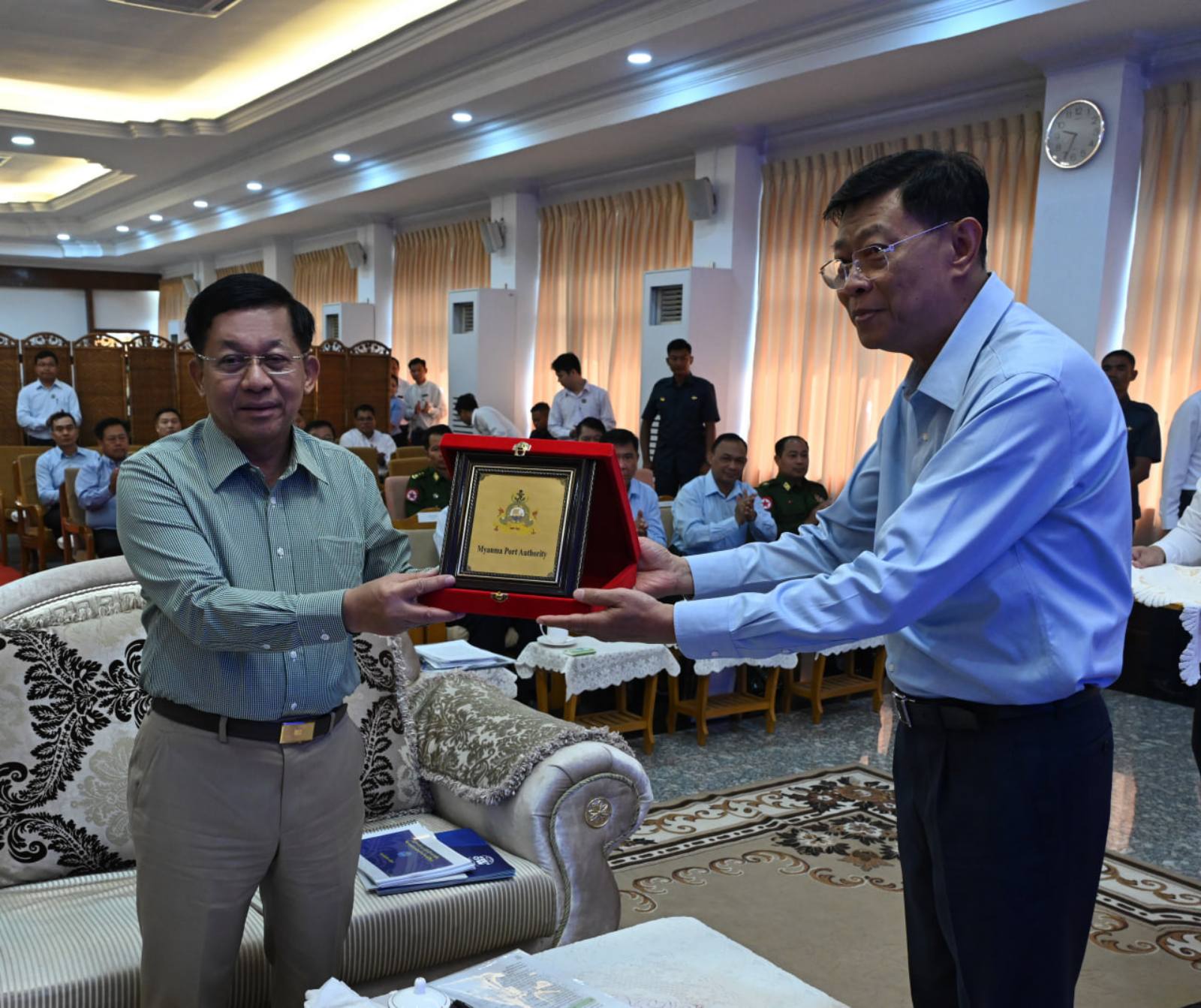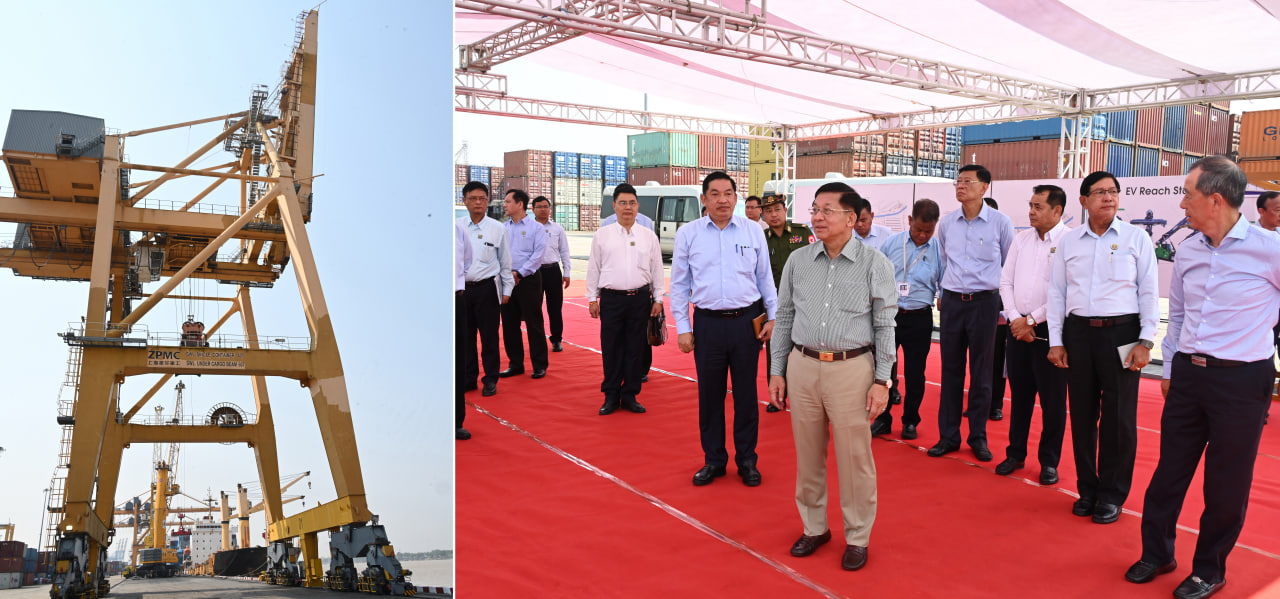 နိုင်ငံတော်စီမံအုပ်ချုပ်ရေးကောင်စီဥက္ကဋ္ဌ နိုင်ငံတော်ဝန်ကြီးချုပ် ဗိုလ်ချုပ်မှူးကြီး မင်းအောင်လှိုင် ဆိပ်ကမ်းလုပ်ငန်းကဏ္ဍစွမ်းဆောင်နိုင်မှုအခြေအနေများနှင့် ကုန်သွယ်မှုဆိုင်ရာအခြေအနေများအား သွားရောက်ကြည့်ရှုစစ်ဆေး