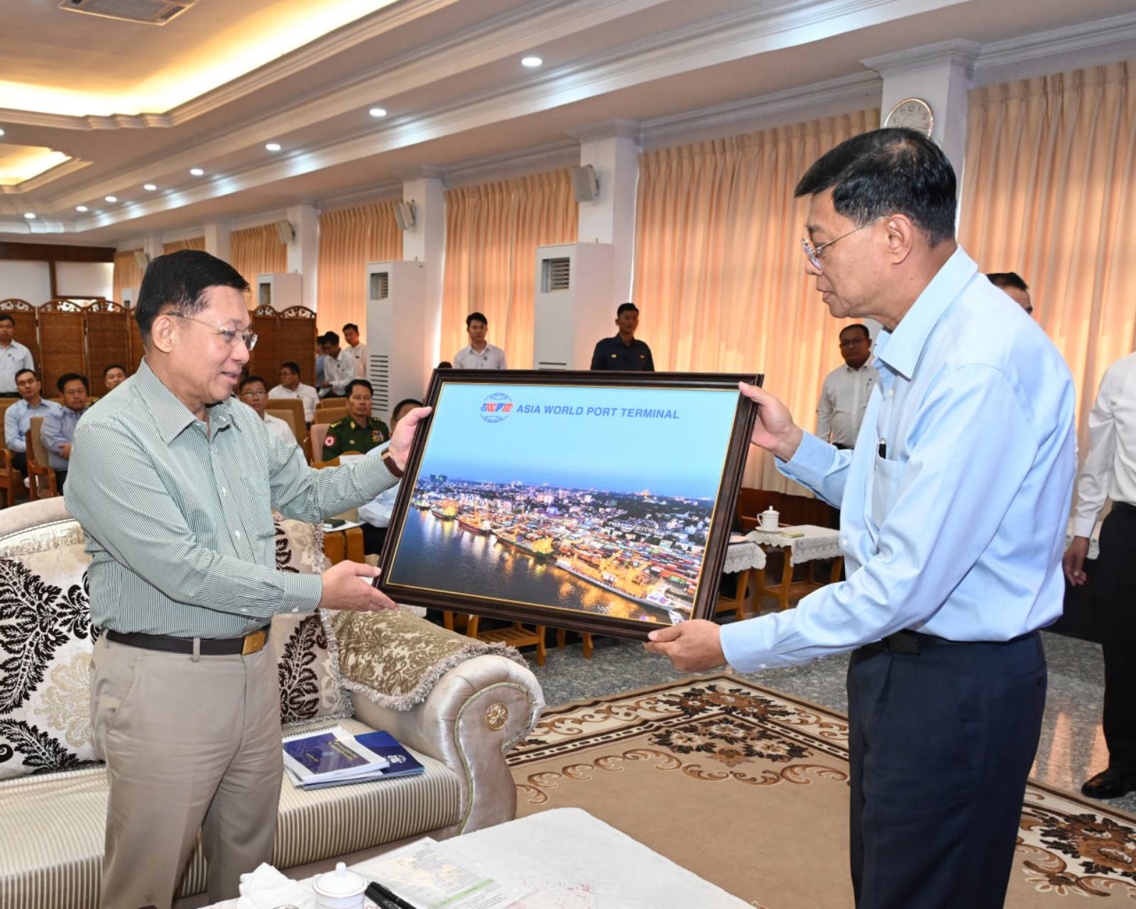 ယင်းနောက် နိုင်ငံတော်စီမံအုပ်ချုပ်ရေးကောင်စီဥက္ကဋ္ဌ နိုင်ငံတော်ဝန်ကြီးချုပ်နှင့် အဖွဲ့ဝင်များသည် Asia World Port Terminal-AWPT ဆိပ်ကမ်းတံတားအတွင်း လှည့်လည်၍ ဆိပ်ကမ်းလုပ်ငန်းများ ဆောင်ရွက်နေမှုများကို ကြည့်ရှုစစ်ဆေးခဲ့ပြီး တာဝန်ရှိသူများ၏ တင်ပြချက်များအပေါ် လိုအပ်သည်များ လမ်းညွှန်မှာကြားခဲ့ကြောင်း သတင်းရရှိသည်။