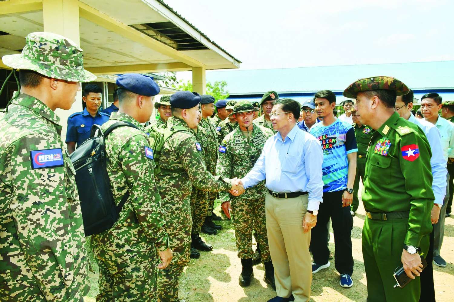 ယင်းနောက် နိုင်ငံတော်စီမံအုပ်ချုပ်ရေးကောင်စီဥက္ကဋ္ဌ နိုင်ငံတော်ဝန်ကြီးချုပ်နှင့် အဖွဲ့ဝင်များသည် ပါရမီရပ်ကွက်ရှိ နှစ်(၇၀၀) ပြည့်အားကစားကွင်း၌ အခြေပြု၍ ငလျင်ဒဏ်သင့်ပြည်သူများအား ကျန်းမာရေးစောင့်ရှောက်မှုလုပ်ငန်းများ ကူညီဆောင်ရွက်ပေးရန် ရောက်ရှိနေသည့် မလေးရှားနိုင်ငံမှဆေးကုသရေးအဖွဲ့များ၏ ယာယီဆေးရုံဆောက်လုပ်လျက်ရှိသည့်နေရာသို့ ရောက်ရှိကြပြီး ဆေးကုသရေးအဖွဲ့များအား ရင်းရင်းနှီးနှီး တစ်ဦးချင်း နှုတ်ဆက်၍ ကျေးဇူးတင်စကား ပြောကြားသည်။