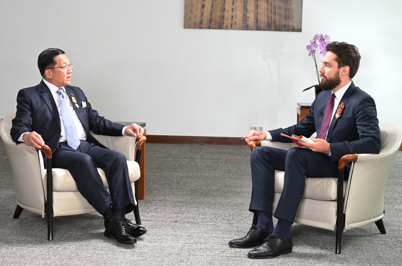နိုင်ငံတော်စီမံအုပ်ချုပ်ရေးကောင်စီဥက္ကဋ္ဌ နိုင်ငံတော်ဝန်ကြီးချုပ် ဗိုလ်ချုပ်မှူးကြီး မင်းအောင်လှိုင် သည် ၂၀၂၅ ခုနှစ်၊ မေလ ၈ ရက်နေ့တွင် ရုရှားနိုင်ငံ RT သတင်းဌာနအား မော်စကိုမြို့၊ Ararat Park ဟိုတယ်ခန်းမ၌ လက်ခံတွေ့ဆုံခဲ့ပြီး သိရှိလိုသည့် မေးမြန်းမှုများကို ဖြေကြား