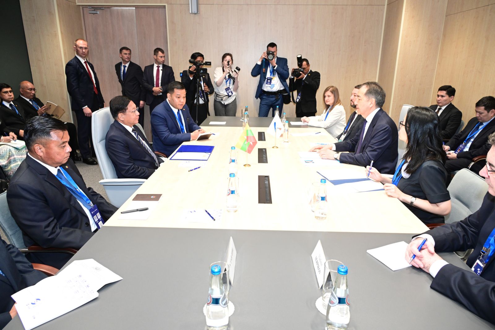 ယင်းနောက် နိုင်ငံတော်စီမံအုပ်ချုပ်ရေးကောင်စီဥက္ကဋ္ဌ နိုင်ငံတော်ဝန်ကြီးချုပ်က ယခုတွေ့ဆုံဆွေးနွေးမှုမှတစ်ဆင့် မိမိတို့မြန်မာနိုင်ငံနှင့် ဥရောပ-အာရှ စီးပွားရေးသမဂ္ဂ (EAEU) အဖွဲ့ဝင်နိုင်ငံများအကြား ပူးပေါင်းဆောင်ရွက်မှုများကို လက်တွေ့အကောင်အထည်ဖော်ဆောင်ရွက်နိုင်ရန် တွန်းအားဖြစ်စေမည်ဟု ယုံကြည်ကြောင်း၊ မြန်မာနိုင်ငံနှင့် ဥရောပ-အာရှ စီးပွားရေးသမဂ္ဂ (EAEU) တို့အကြား ၂၀၂၃ ခုနှစ်တွင် ပူးပေါင်းဆောင်ရွက်မှုစာချွန်လွှာ လက်မှတ်ရေးထိုးခဲ့ပြီးဖြစ်ကြောင်း၊ ထို့ပြင် ၂၀၂၃ ခုနှစ်၊ ဇွန်လတွင် ရုရှားဖက်ဒရေးရှင်း နိုင်ငံ၊ စိန့်ပီတာစဘတ်မြို့၌ ပြည်ထောင်စုသမ္မတမြန်မာနိုင်ငံတော်အစိုးရနှင့် ဥရောပ-အာရှ စီးပွားရေးကော်မရှင် (EEC) တို့အကြား ပူးပေါင်းဆောင်ရွက်မှုစာချွန်လွှာ (Memorandum of Cooperation-MOC) အား လက်မှတ်ရေးထိုးနိုင်ခဲ့ကြောင်း၊ မြန်မာနိုင်ငံနှင့် (EAEU) အဖွဲ့ဝင်နိုင်ငံများအကြား ပူးပေါင်းဆောင်ရွက်နိုင်မည့် အခွင့်အလမ်းများစွာကိုလည်း လေ့လာတွေ့ရှိရပါကြောင်း၊ လက်မှတ်ရေးထိုးထားသည့် ပူးပေါင်းဆောင်ရွက်မှုစာချွန်လွှာအား အကောင်အထည်ဖော်ဆောင်ရွက်ခြင်းမှတစ်ဆင့် ဥရောပ-အာရှ စီးပွားရေးသမဂ္ဂ (EAEU) ၏ လေ့လာသူနိုင်ငံအဆင့်အထိ တက်လှမ်းနိုင်မည်ဟုလည်း ယုံကြည်မျှော်လင့်ထားကြောင်း၊ မြန်မာနိုင်ငံအနေဖြင့် လက်တွေ့အကောင်အထည်ဖော်ဆောင်ရွက်မှုများဖြင့် ပူးပေါင်းဆောင်ရွက်မှုကို ပိုမိုခိုင်မာကျယ်ပြန့်စေရေး ဆောင်ရွက်သွားမည်ဖြစ်ကြောင်းဖြင့် ပြန်လည်ဆွေးနွေးပြောကြားသည်။