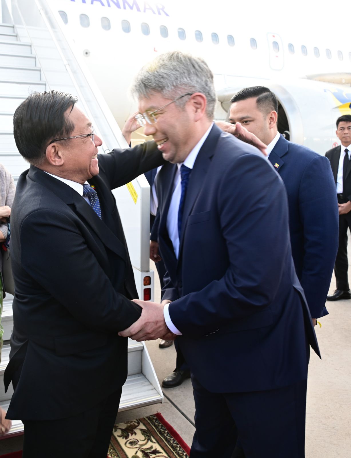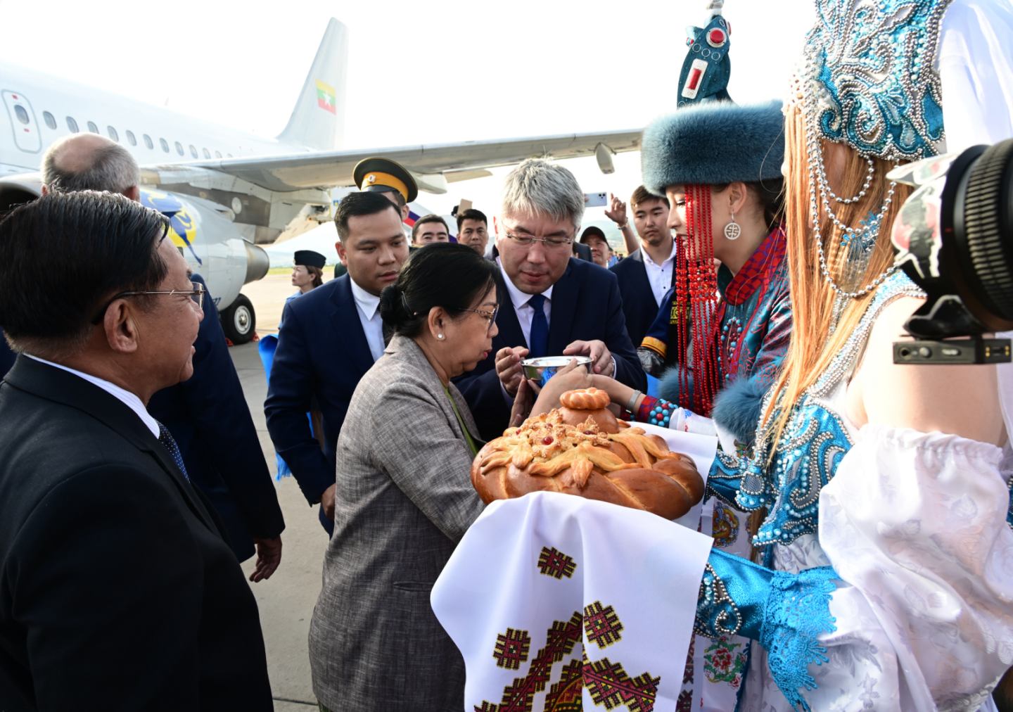 ဦးစွာ နိုင်ငံတော်စီမံအုပ်ချုပ်ရေးကောင်စီဥက္ကဋ္ဌ နိုင်ငံတော်ဝန်ကြီးချုပ် ဗိုလ်ချုပ်မှူးကြီး မင်းအောင်လှိုင်နှင့် ဇနီး ဒေါ်ကြူကြူလှ ဦးဆောင်သော မြန်မာအဆင့်မြင့်ကိုယ်စားလှယ်အဖွဲ့သည် ညစာစားပွဲနေရာသို့ ရောက်ရှိကြရာ Buryatia ပြည်နယ်၊ ပြည်နယ်အကြီးအကဲ၊ ဒုတိယပြည်နယ်အကြီးအကဲနှင့် တာဝန်ရှိသူများက လှိုက်လှဲနွေးထွေးစွာ ကြိုဆိုနှုတ်ဆက်ကြသည်။