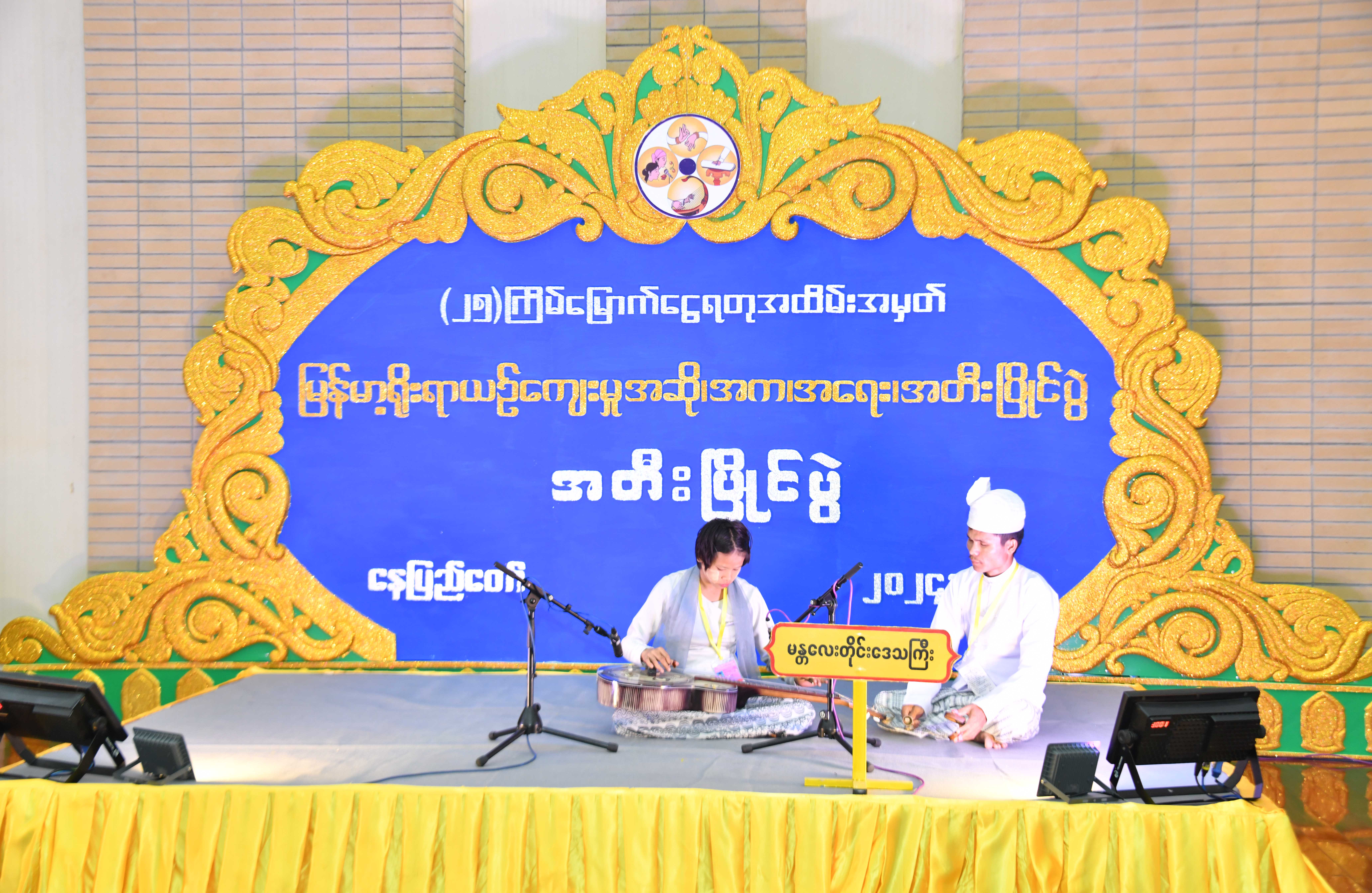 ဦးစွာ နိုင်ငံတော်စီမံအုပ်ချုပ်ရေးကောင်စီဥက္ကဋ္ဌ နိုင်ငံတော်ဝန်ကြီးချုပ်နှင့်ဇနီး၊ အဖွဲ့ဝင်များသည် ဝါသနာရှင်အဆင့်(ပထမတန်း) အမျိုးသမီးပြိုင်ပွဲဝင်များက ခေါင်း၊ ခါး၊ ခြေ၊ လက် အချိုးအဆစ် ညီညာစွာ အသုံးပြု၍ သက်ဆိုင်ရာ တိုင်းဒေသကြီးနှင့်ပြည်နယ်အလိုက် ဆိုင်းဝိုင်းအဖွဲ့များ၏ ပံ့ပိုးတီးခတ်မှုနှင့်အတူ အနုသုခုမရသစုံလင်လှသည့် ဆို၊ငို၊ ပြော အကအလှများဖြင့် ကကြိုးကကွက်စုံလင်စွာ ယှဉ်ပြိုင်ကပြဖျော်ဖြေနေမှုကို ကြည့်ရှုအားပေးကြသည်။