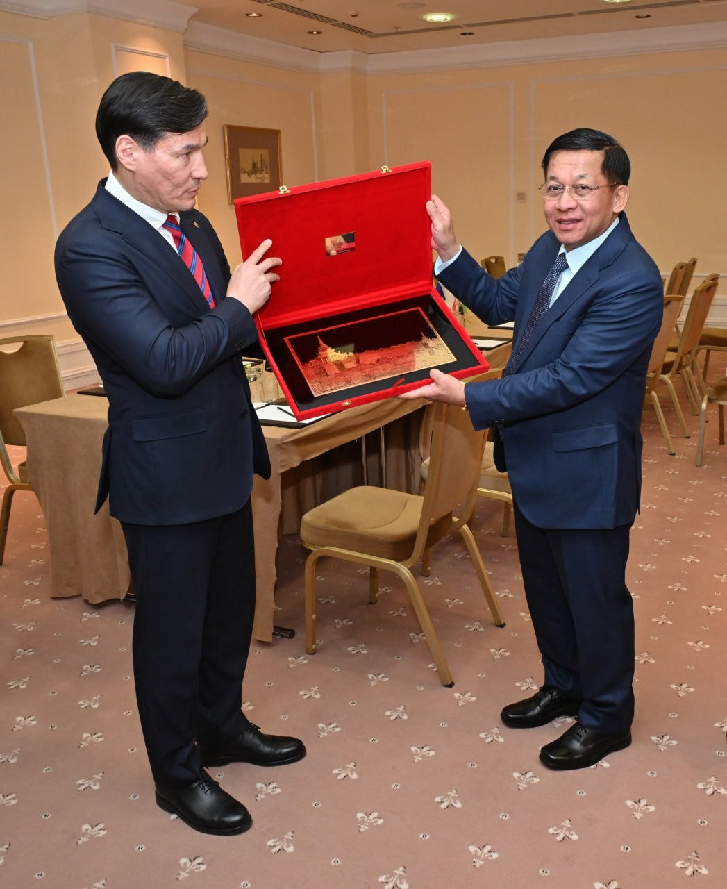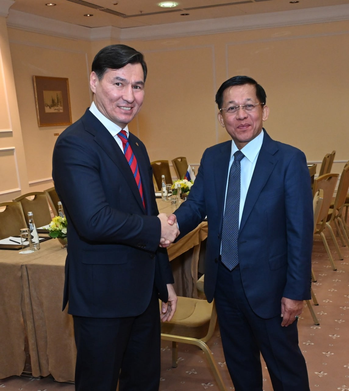 ရုရှားဖက်ဒရေးရှင်းနိုင်ငံ မော်စကိုမြို့၌ တရားဝင်ချစ်ကြည်ရေးခရီး ရောက်ရှိနေသည့် နိုင်ငံတော်စီမံအုပ်ချုပ်ရေးကောင်စီဥက္ကဋ္ဌ နိုင်ငံတော်ဝန်ကြီးချုပ် ဗိုလ်ချုပ်မှူးကြီးမင်းအောင်လှိုင် ထံသို့ ရုရှားဖက်ဒရေးရှင်းနိုင်ငံ ဒူးမားလွှတ်တော် ဒုတိယဥက္ကဋ္ဌ H.E. Mr.Sholban Kara-Ool သည် ယနေ့ဒေသစံတော်ချိန် မွန်းလွဲပိုင်းတွင် Radisson Collection ဟိုတယ်၌ လာရောက်ဂါရဝပြုတွေ့ဆုံသည်။