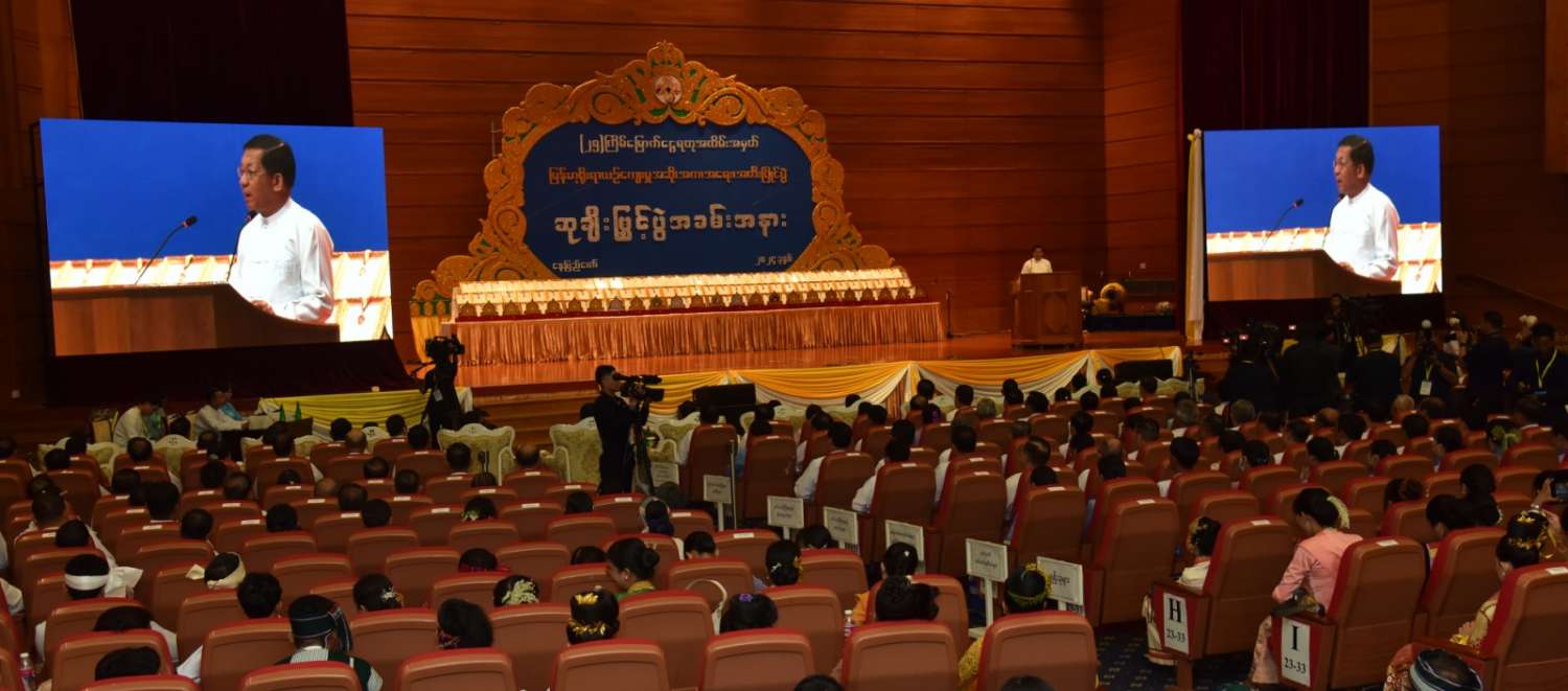 (၂၅)ကြိမ်မြောက် ငွေရတုအထိမ်းအမှတ် မြန်မာ့ရိုးရာယဉ်ကျေးမှု အဆို၊ အက၊ အရေး၊ အတီးပြိုင်ပွဲ ဆုချီးမြှင့်ပွဲအခမ်းအနားကို ယနေ့နံနက်ပိုင်းတွင် နေပြည်တော်ရှိ မြန်မာအပြည်ပြည်ဆိုင်ရာ ကွန်ဗင်းရှင်းဗဟိုဌာန-၂ ၊ ညီလာခံခန်းမ၌ကျင်းပရာ နိုင်ငံတော်စီမံအုပ်ချုပ်ရေးကောင်စီဥက္ကဋ္ဌ နိုင်ငံတော်ဝန်ကြီးချုပ် ဗိုလ်ချုပ်မှူးကြီးမင်းအောင်လှိုင် တက်ရောက်အမှာစကားပြောကြားသည်။