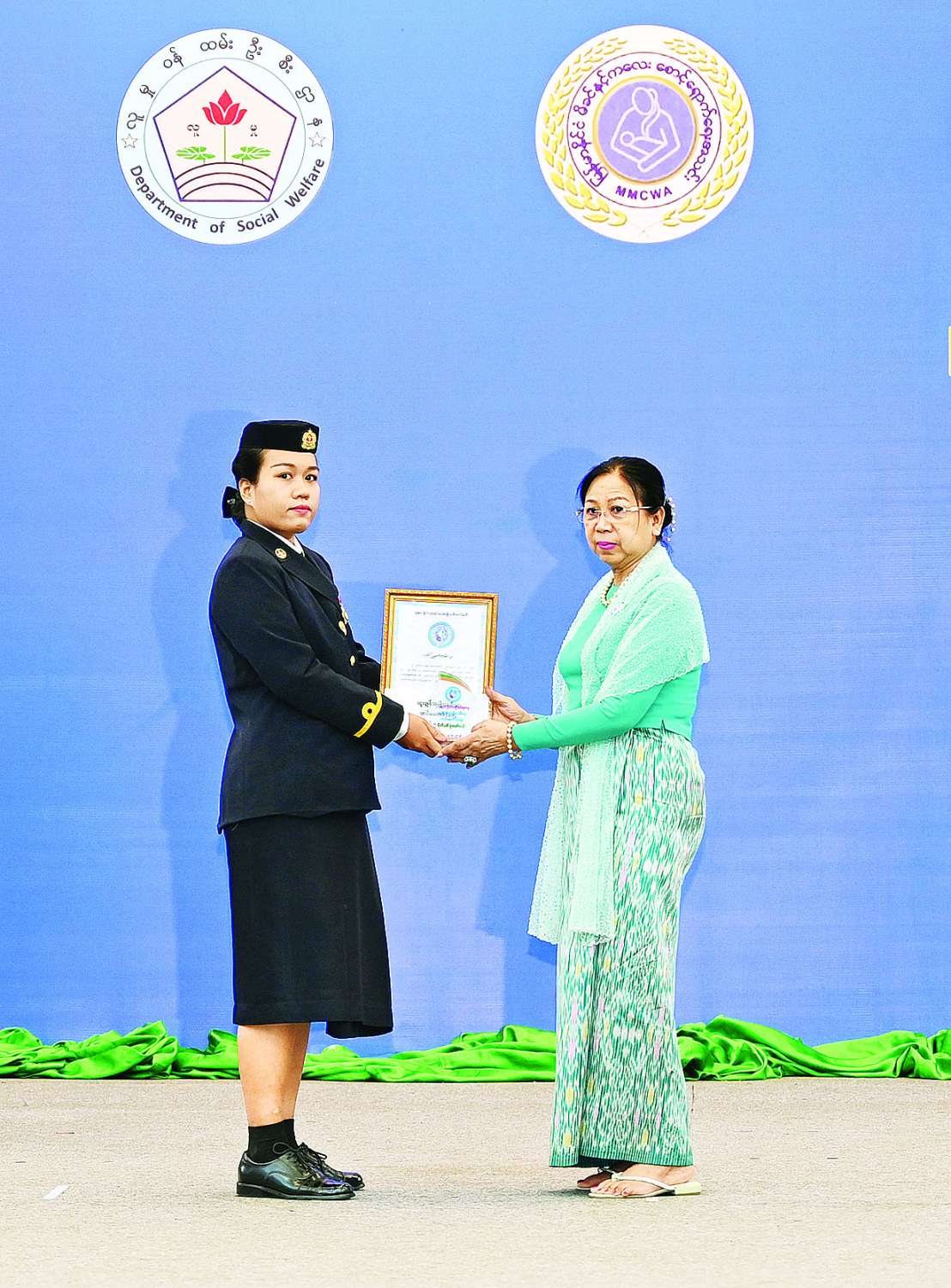 ဆက်လက်၍ နိုင်ငံတော်စီမံအုပ်ချုပ် ရေးကောင်စီအဖွဲ့ဝင်များ၏ ဇနီးများ၊ ကောင်စီအဖွဲ့ဝင်ဒေါ်ဒွဲဘူနှင့် မြန်မာနိုင်ငံလုံးဆိုင်ရာ အမျိုးသမီးကော်မတီဥက္ကဋ္ဌတို့က အမျိုးသမီး စီးပွားရေး စွမ်းဆောင်ရှင်ဆု ရရှိကြသူများကို ဂုဏ်ပြုဆုတံဆိပ်၊ ဂုဏ်ပြုမှတ်တမ်းလွှာနှင့် ဂုဏ်ပြုဆုငွေများ ပေးအပ်ချီးမြှင့်ကြသည်။