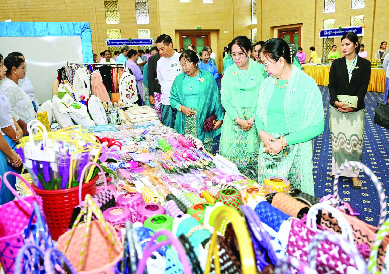 ယင်းနောက် မြန်မာနိုင်ငံအမျိုးသမီးရေးရာအဖွဲ့ချုပ် ဂုဏ်ထူးဆောင်နာယက နိုင်ငံတော်စီမံအုပ်ချုပ်ရေးကောင်စီဥက္ကဋ္ဌ နိုင်ငံတော်ဝန်ကြီးချုပ်၏ဇနီးသည် အခမ်းအနားသို့ တက်ရောက်လာကြသူများနှင့်အတူ စုပေါင်းမှတ်တမ်းတင် ဓာတ်ပုံရိုက်ပြီး ၂၀၂၄ ခုနှစ် မြန်မာအမျိုးသမီးများနေ့ အထိမ်းအမှတ်ခင်းကျင်းပြသထားသည့် ထုတ်ကုန်ပစ္စည်းများကို ကြည့်ရှုလေ့လာအားပေးခဲ့ကြောင်း သတင်းရရှိသည်။