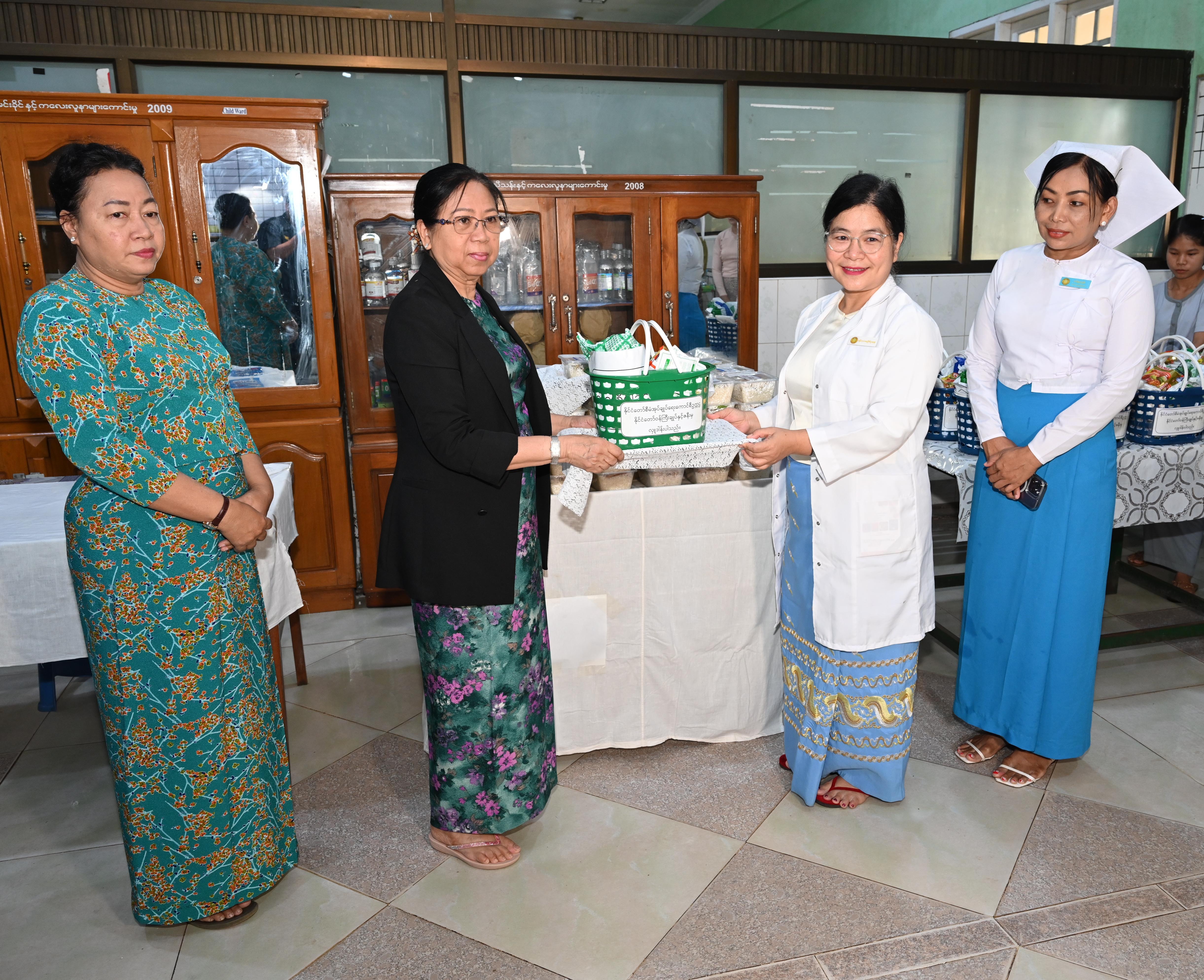 ဆက်လက်ပြီး နိုင်ငံတော်စီမံအုပ်ချုပ်ရေးကောင်စီဥက္ကဋ္ဌ တပ်မတော်ကာကွယ်ရေးဦးစီးချုပ်၏ ဇနီးနှင့် အဖွဲ့ဝင်များသည် ပြင်ဦးလွင်မြို့၊ နယ်မြေခံတပ်မတော်ဆေးရုံသို့ ရောက်ရှိပြီး သားဖွားမီးယပ်နှင့် ကလေးကုသဆောင်ရှိ ဆေးရုံတက်ရောက်ကုသမှုခံယူနေသူများအား ရင်းရင်းနှီးနှီး မေးမြန်းအားပေးစကား ပြောကြားကာ စားသောက်ဖွယ်ရာပစ္စည်းများ ပေးအပ်သည်။ ထို့နောက် နိုင်ငံတော်စီမံအုပ်ချုပ်ရေးကောင်စီဥက္ကဋ္ဌ တပ်မတော်ကာကွယ်ရေးဦးစီးချုပ်၏ ဇနီးက ဆေးရုံ၌ တက်ရောက်ဆေးကုသမှု ခံယူလျက်ရှိသည့် အရာရှိ၊ စစ်သည်၊ မိသားစုဝင်များအတွက် နေ့လယ်စာအာဟာရနှင့် ဆေးရုံအတွက် လှူဒါန်းငွေများကို ပေးအပ်ရာ ဆေးရုံအုပ်ကြီးက လက်ခံရယူခဲ့ကြောင်းနှင့် အာဟာရဌာနခွဲ၌ အရာရှိ၊ စစ်သည်များ၏ နေ့လယ်စာအာဟာရ သုံးဆောင်နေမှုအား လိုက်လံကြည့်ရှုအားပေးခဲ့ကြောင်း သတင်းရရှိသည်။
