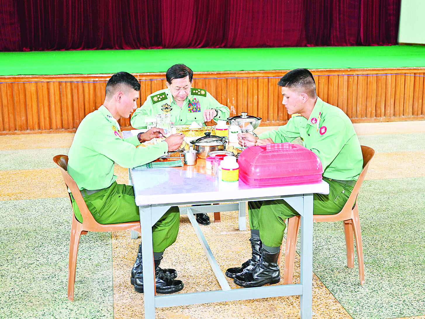 မွန်းလွဲပိုင်းတွင် နိုင်ငံတော်စီမံအုပ်ချုပ်ရေးကောင်စီဥက္ကဋ္ဌ တပ်မတော်ကာကွယ်ရေးဦးစီးချုပ်နှင့် အဖွဲ့ဝင်များသည် စစ်တက္ကသိုလ် အနော်ရထာတပ်ရင်း ဗိုလ်လောင်းစားရိပ်သာနှင့် တပ်မတော်နည်းပညာတက္ကသိုလ် ပညာတန်ဆောင် ဗိုလ်လောင်းစားရိပ်သာတို့၌ သင်တန်းသားဗိုလ်လောင်းများနှင့်အတူ နေ့လယ်စာ အတူတကွ သုံးဆောင်ကြပြီး ဗိုလ်လောင်းများအား ရင်းရင်းနှီးနှီး လိုက်လံနှုတ်ဆက်၍ လိုအပ်ချက်များအား မေးမြန်းဖြည့်ဆည်းပေးသည်။