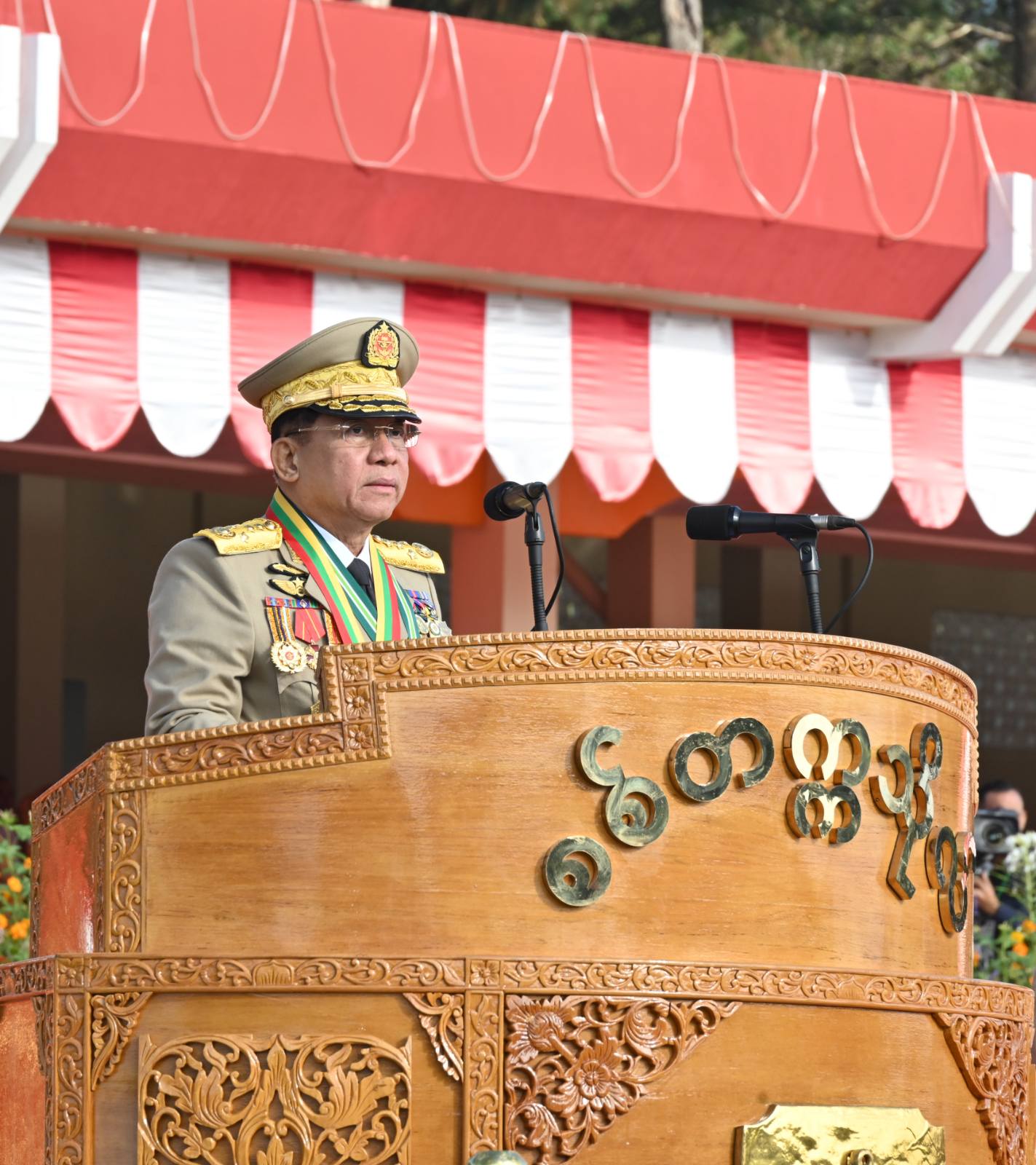 စစ်တက္ကသိုလ် ဗိုလ်လောင်းသင်တန်းအမှတ်စဉ်(၆၆) သင်တန်းဆင်းဂုဏ်ပြု စစ်ရေးပြအခမ်းအနားကို ယနေ့နံနက်ပိုင်းတွင် ပြင်ဦးလွင်မြို့၊ စစ်တက္ကသိုလ်စစ်ရေးပြကွင်း၌ ကျင်းပပြုလုပ်ရာ နိုင်ငံတော်စီမံအုပ်ချုပ်ရေးကောင်စီဥက္ကဋ္ဌ တပ်မတော်ကာကွယ်ရေးဦးစီးချုပ် ဗိုလ်ချုပ်မှူးကြီး သတိုးမဟာသရေစည်သူ သတိုးသီရိသုဓမ္မ မင်းအောင်လှိုင် တက်ရောက်မိန့်ခွန်း ပြောကြားသည်။