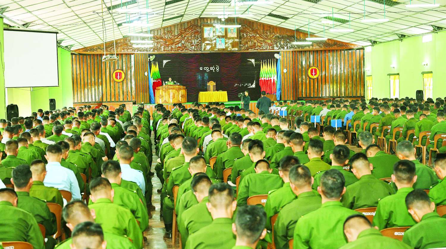 တပ်မတော်ပိုင်းနှင့် ပတ်သက်၍ တပ်မတော်သားများသည် မည်သူတစ်ဦးတစ်ယောက်၏ တိုက်တွန်းချက်မျှ မပါရှိဘဲ နိုင်ငံတော်ကာကွယ်ရေးနှင့် လုံခြုံရေးတာဝန်များကို ထမ်းဆောင်မည် ဟူသည့် မွန်မြတ်သည့်စိတ်ဓာတ်များဖြင့် တပ်မတော်အတွင်းသို့ ဝင်ရောက်ခဲ့ကြသူများပင်ဖြစ်ကြောင်း၊ ထိုကဲ့သို့သော အခြေခံစိတ်ဓာတ်ကောင်းများကို ဆက်လက်ထိန်းသိမ်းပြီး နိုင်ငံတော်နှင့် တပ်မတော်မှပေးအပ်လာသော တာဝန်များကို ဂုဏ်ယူစွာဖြင့် ဆက်လက်ထမ်းဆောင်သွားကြရမည်ဖြစ်ကြောင်း၊ တာဝန်များကိုထမ်းဆောင်ရာ၌ မိမိတို့အား ပေးအပ်လာသည့်တာဝန်များကို စွမ်းရည်သတ္တိအပြည့်ဖြင့် အောင်မြင်အောင် ထမ်းဆောင်ကြရန်လိုပြီး စိတ်ပိုင်း၊ ရုပ်ပိုင်းဆိုင်ရာအရ ကျန်းမာကြံ့ခိုင်မှုရှိရန်၊ ဇွဲ၊ လုံ့လ၊ ဝီရိယအပြည့်ဖြင့် တာဝန်ထမ်းဆောင်ကြရန်လိုကြောင်း၊ ယခုကဲ့သို့ သင်တန်းများမှ သင်ကြားပို့ချပေးသည့် စစ်နည်းဗျူဟာများ၊ စစ်အခြေခံသဘောတရားများကို အမှန်တကယ် သိရှိနားလည် တတ်ကျွမ်းမှုရှိအောင် သင်ယူလေ့လာသွားကြရန်လိုပြီး လက်တွေ့စစ်မြေပြင်တွင် အကျိုးရှိရှိအသုံးချနိုင်ရမည်ဖြစ်ကြောင်း၊ စိတ်ဓာတ်ကြံ့ခိုင်မှုရှိပါက လုပ်ငန်းများကို ရာနှုန်းပြည့် အောင်မြင်အောင် ထမ်းဆောင်နိုင်မည်ဖြစ်ပြီး တစ်ဦးချင်းစိတ်ဓာတ်ခိုင်မာမှုရှိစေရေး၊ ကြံ့ခိုင်မှု ရှိစေရေး ယုံကြည်ချက်၊ ခံယူချက်ကောင်းစွာဖြင့် နိုင်ငံတော်ကာကွယ်ရေးတာဝန်များကို ထမ်းဆောင်သွားကြရန်လိုကြောင်း၊ သင်တန်းသားအရာရှိများအနေဖြင့် တစ်ဦးချင်းစီအလိုက် ရည်မှန်းချက်များ ကိုယ်စီရှိကြမည်ဖြစ်ပြီး မိမိတို့၏ ရည်မှန်းချက်များ အောင်မြင်မှုရှိစေရေး၊ မပျောက်ပျက်စေရေး မလျှော့သော ဇွဲ၊ လုံ့လများဖြင့် ဆက်လက်ကြိုးပမ်း ဆောင်ရွက်သွားကြရန်လိုကြောင်း၊ ယနေ့ခေတ်သည် နည်းပညာခေတ်ဖြစ်သဖြင့် ပြောင်းလဲတိုးတက်နေသည့် နည်းပညာရပ်များ၊ စစ်နည်းဗျူဟာများကို မျက်ခြည်မပြတ် သိရှိနေစေရေး စဉ်ဆက်မပြတ်သည့် လေ့လာဆည်းပူးမှုများကို ဆောင်ရွက်သွားကြရမည်ဖြစ်ကြောင်း၊ ခိုင်မာတည်ကြည်သည့် စိတ်ဓာတ်များဖြင့် မိမိကိုယ်ကိုထိန်းသိမ်း၍ ရည်မှန်းချက်များ အောင်မြင်မှုရရှိအောင် ဆက်လက်ဆောင်ရွက်သွားကြရန်လိုကြောင်း။